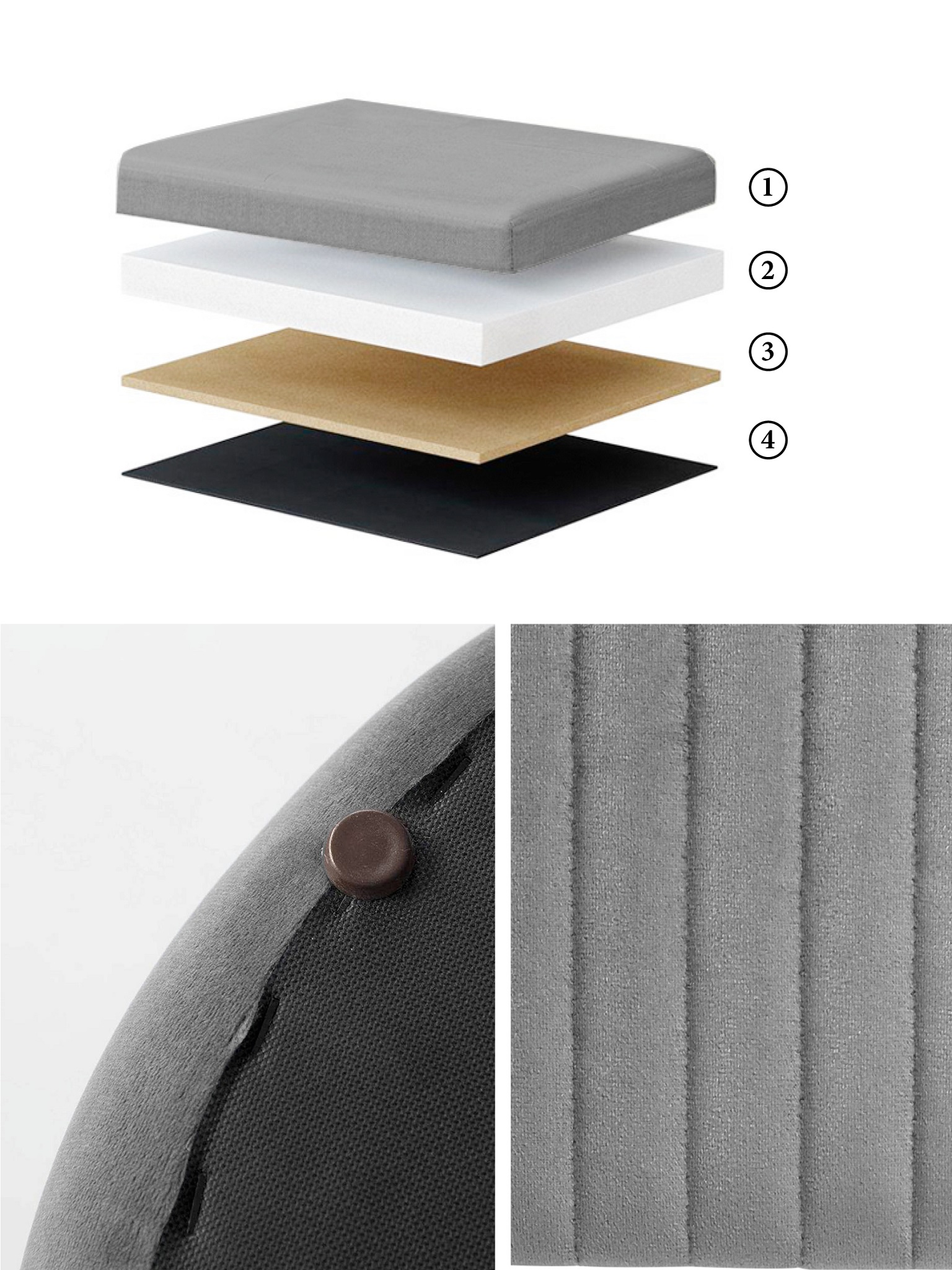 Обивка износостойкой тканью велюр, с горизонтальной декоративной стежкой на сидении.