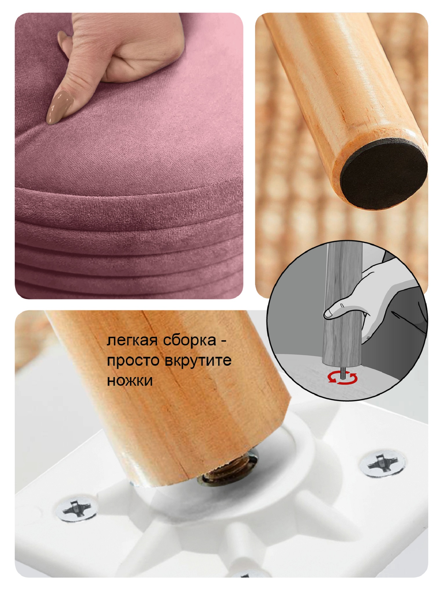 Широкая банкетка установлена на 4 высокие ножки, которые при сборке необходимо прикрутить.