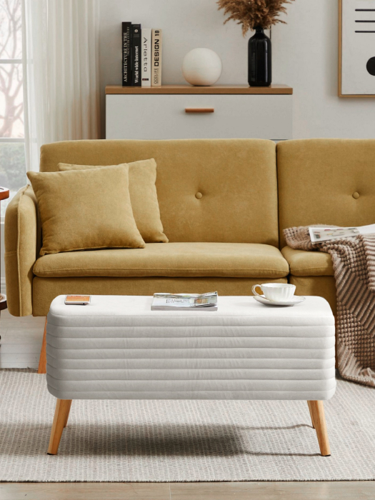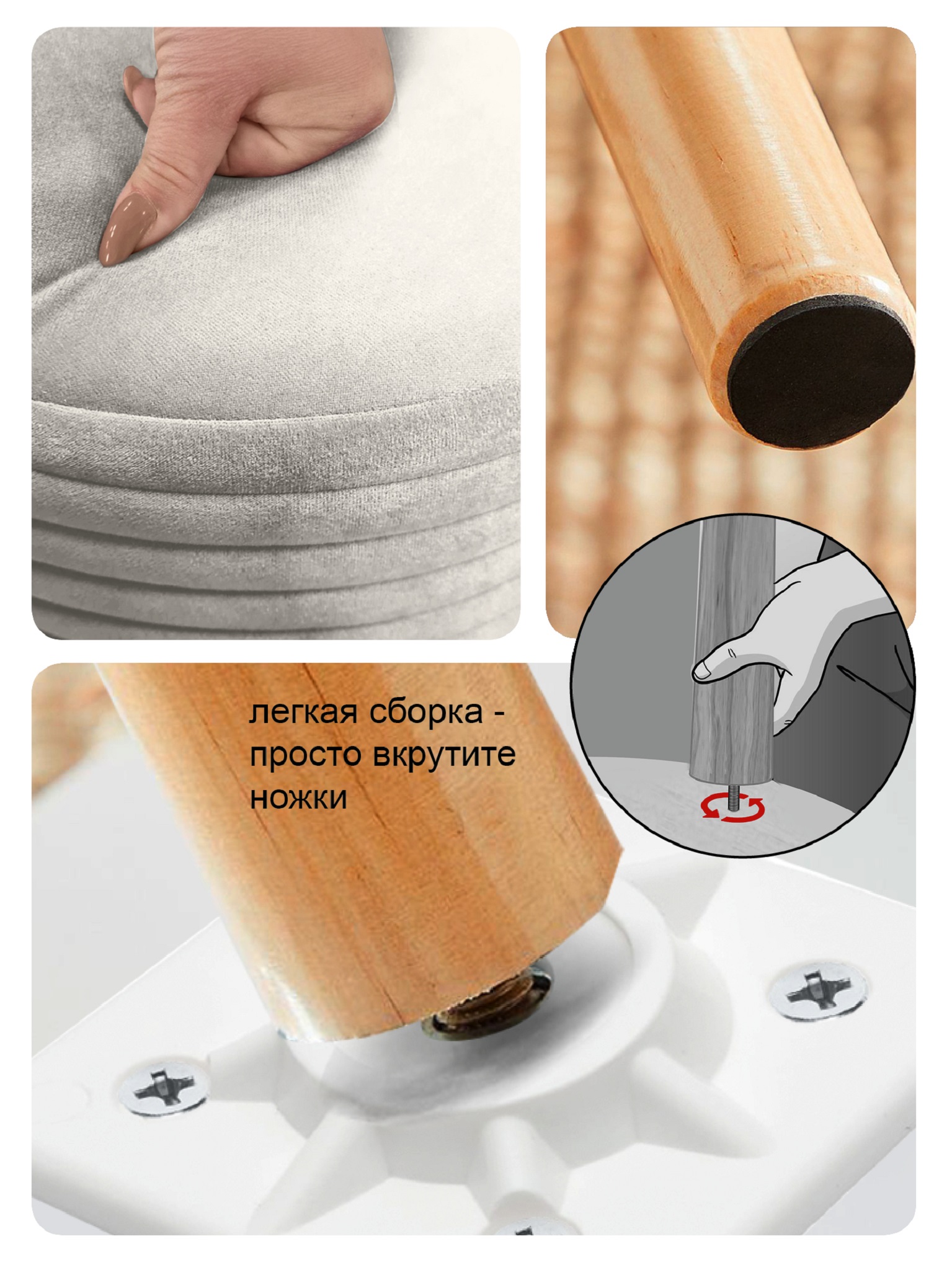 Широкая банкетка установлена на 4 высокие ножки, которые при сборке необходимо прикрутить.