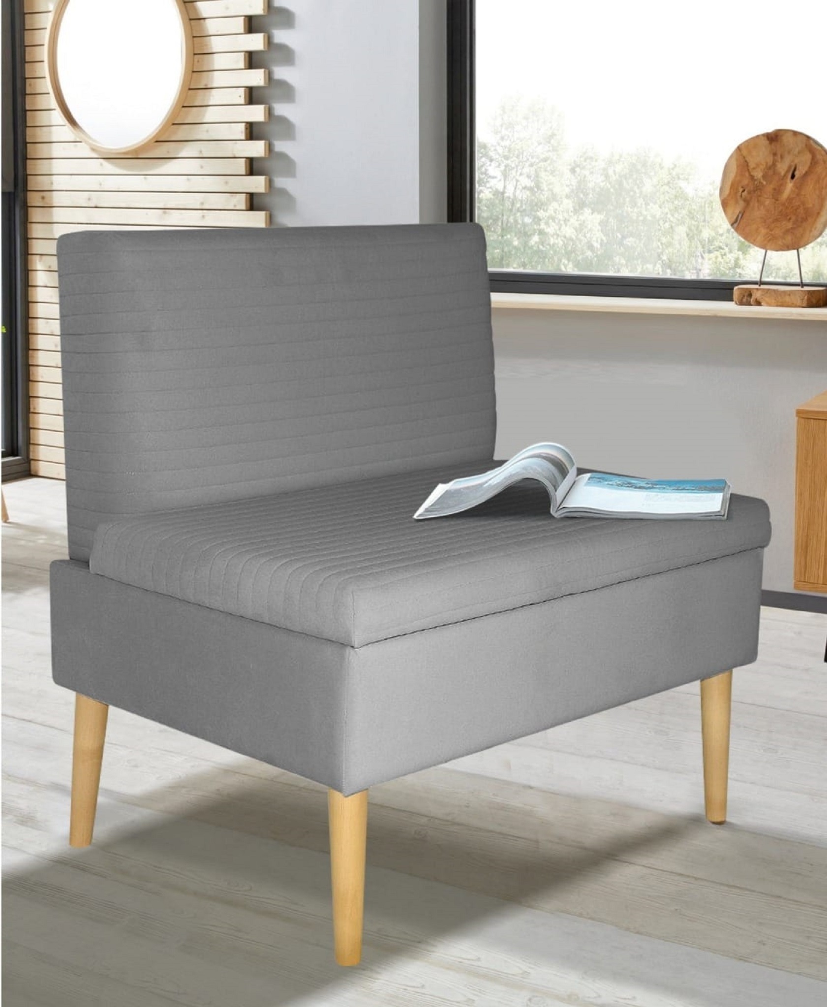 Установлен диванчик на высокие опоры, изготовленные из массива берёзы.