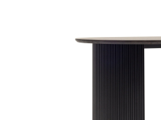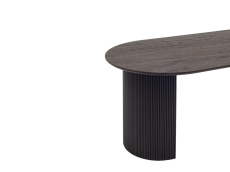 Столешница выполнена из прочного и долговечного МДФ. Темная поверхность столешницы гармонично сочетается с массивными ножками черного цвета. Простая овальная форма стола позволит легко вписать его в современный интерьер, стол украсит кухню, гостиную или современное кафе, ресторан. Опорные плиссированные ножки в лаконичном дизайне надёжно удерживают всю конструкцию и дополняют монолитный образ.