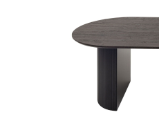 Столешница выполнена из прочного и долговечного МДФ. Темная поверхность столешницы гармонично сочетается с массивными ножками черного цвета. Простая овальная форма стола позволит легко вписать его в современный интерьер, стол украсит кухню, гостиную или современное кафе, ресторан. Опорные плиссированные ножки в лаконичном дизайне надёжно удерживают всю конструкцию и дополняют монолитный образ.