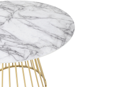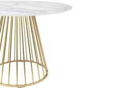 Стильный стол с металлическим основанием. Круглая столешница с рисунком белого мрамора выполнена из МДФ - прочного, экологически безопасного материала, который устойчив к перепадам температур и повышенной влажности. Поверхность столешницы декорирована рисунком белого мрамора, который идеально сочетается с металлическим основанием в золотом цвете. Защитные подпятники в основании предотвращают порчу напольного покрытия. Разрешенная нагрузка до: 80 кг. Диаметр основания стола: 110 см. Толщина столешницы: 1.8 см