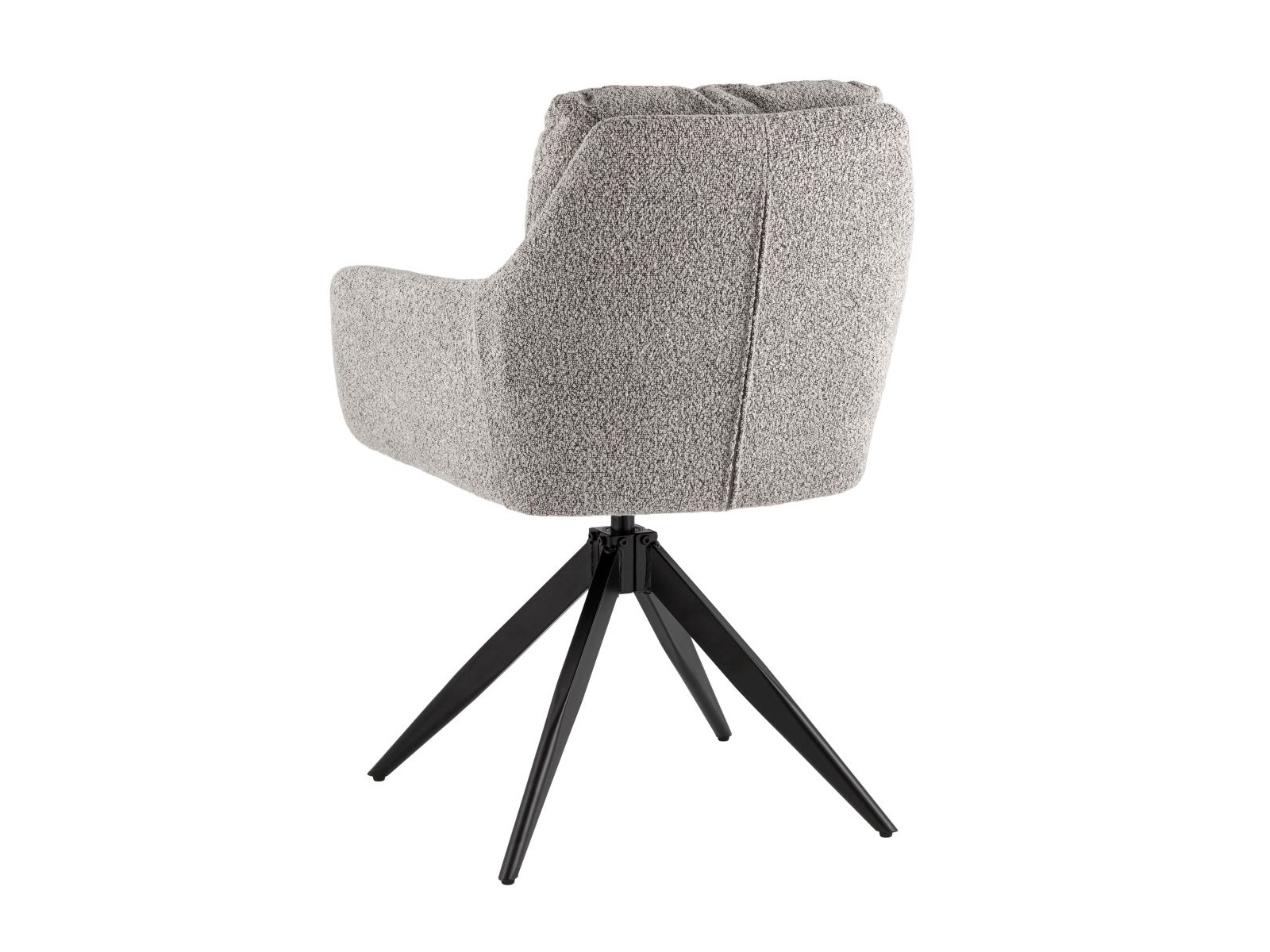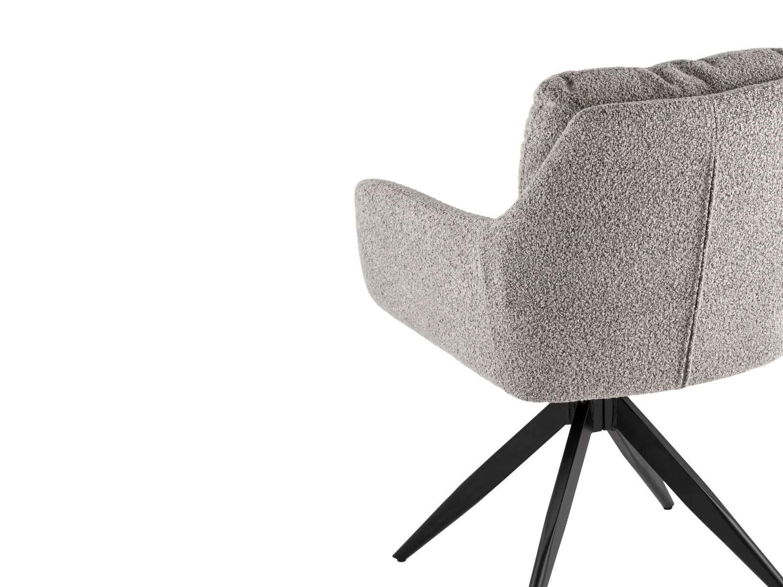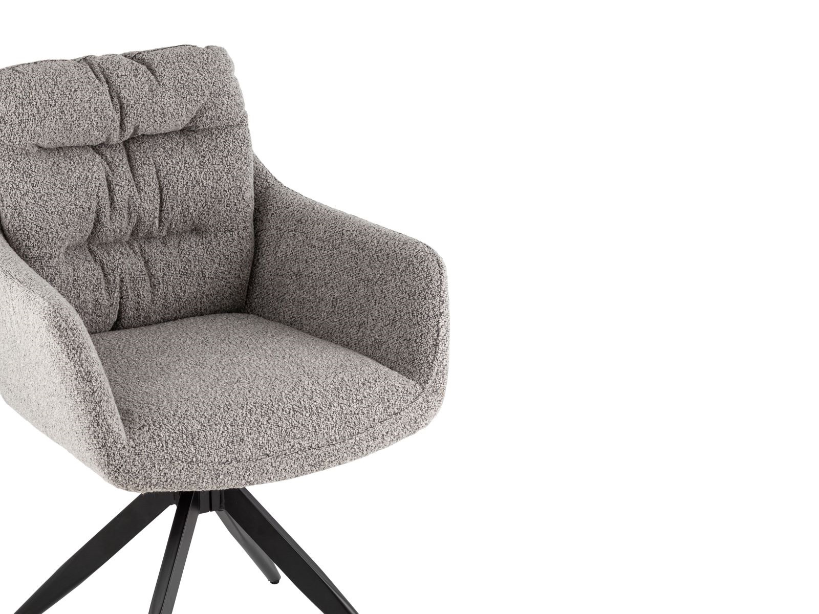 Материалы и удобство. Обивка из ткани букле добавляет текстуры и создаёт приятные тактильные ощущения, делая стул особенно комфортным для сидения. Мягкое сиденье обеспечивает дополнительное удобство, а подлокотники создают ощущение поддержки и уюта, идеально подходя для длительного пребывания за столом.