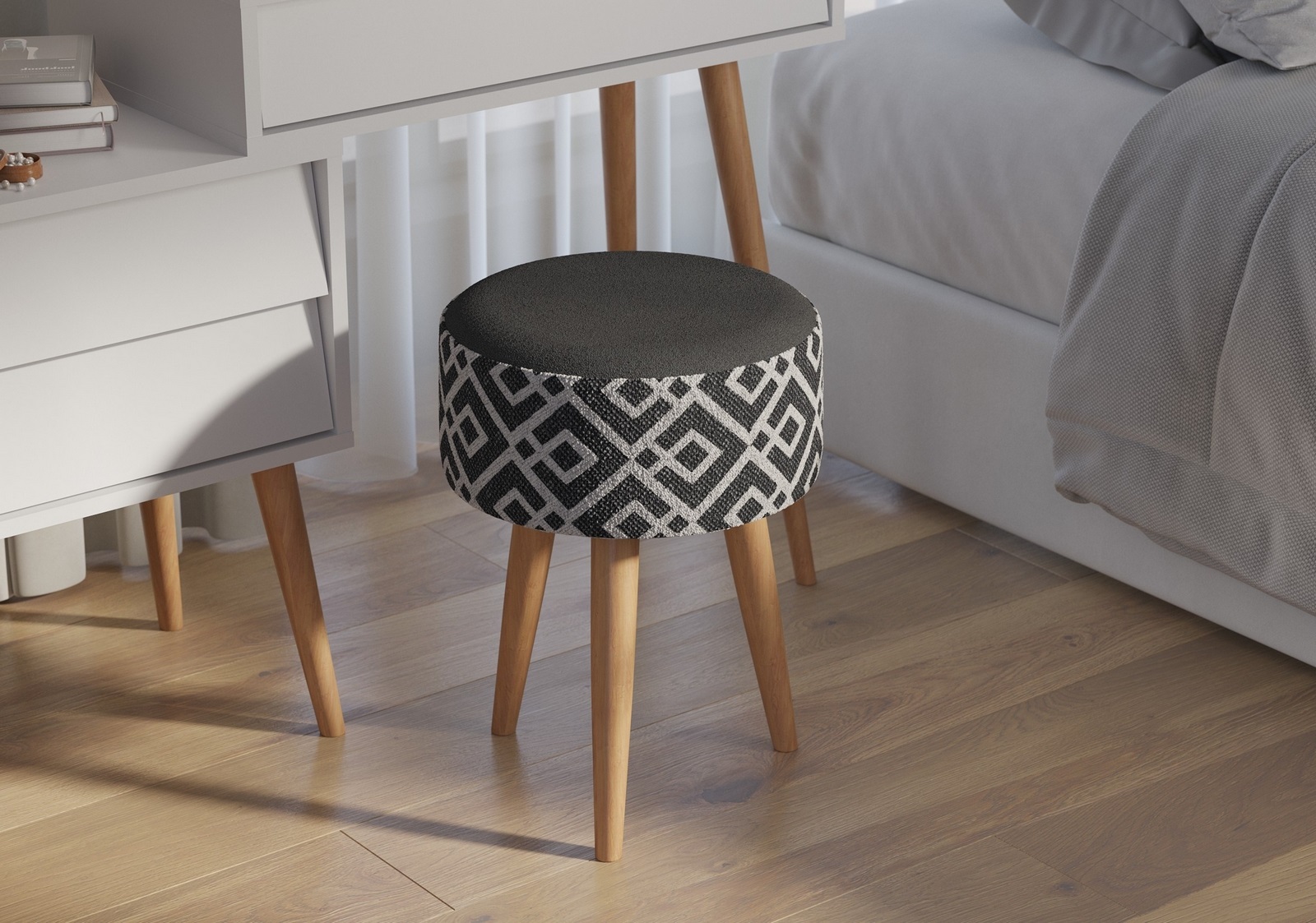 Круглая форма сиденья делает банкетку удобной в использовании. Модель оснащена мягким сиденьем с обивкой из прочной ткани с рисунком, что придаёт ей эстетичный вид и приятные тактильные ощущения. Прочный корпус установлен на устойчивые деревянные ножки высотой 30 см, что обеспечивает оптимальную высоту для комфортного сидения. Внутри банкетки используется наполнитель ППУ, который сохраняет форму и обеспечивает удобство при посадке. Максимальная нагрузка на конструкцию составляет 90 кг.
