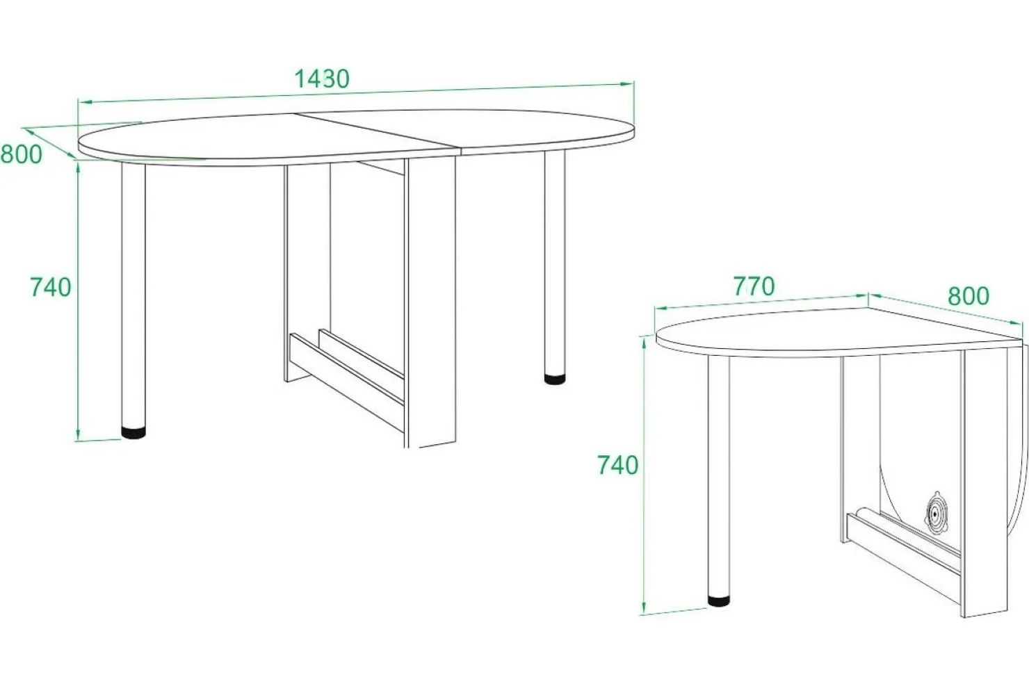 Столешница в сложенном виде имеет форму полуовала,