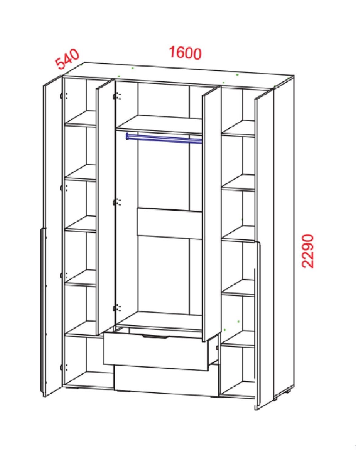Внутри шкаф оборудован 7 полками для одежды и белья и штангой под плечики.