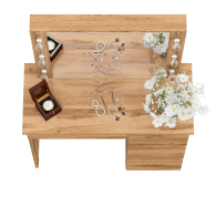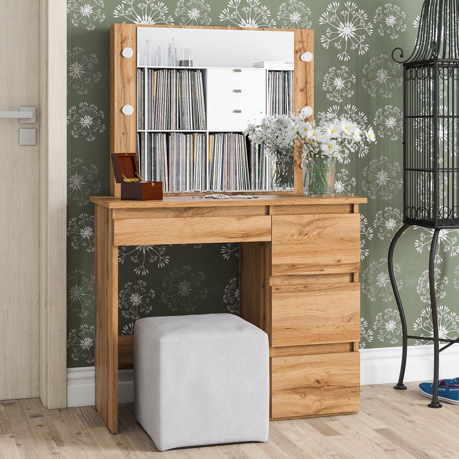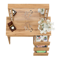Элегантный дизайн и продуманная конструкция делают его удобным и практичным дополнением интерьера. Стол оснащен широкой панелью с зеркалом, которое обеспечивает комфортное отражение для нанесения макияжа. По бокам от зеркала предусмотрены отверстия для установки подсветки (по три с каждой стороны), что создаёт качественное освещение без теней.