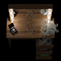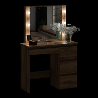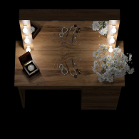 Особенностью этого косметического стола являются отверстия для установки подсветки – по три с каждой стороны от зеркала. Это позволяет легко организовать равномерное освещение лица, что особенно важно при нанесении макияжа или выполнении уходовых процедур. В комплекте уже есть всё необходимое для подключения подсветки - выключатель, трёхметровый провод, штепсельная вилка, прижимные кольца и шесть патронов E14. Лампочки с цоколем Е14 приобретаются отдельно, что позволяет Вам самостоятельно выбрать оптимальную яркость, мощность и цветовую температуру, подходящую именно для вашего интерьера. Это не только удобное решение, но и возможность создать атмосферу, которая будет максимально комфортной для Вас. Кроме того, отсутствие лампочек в комплекте исключает риск их повреждения при транспортировке.