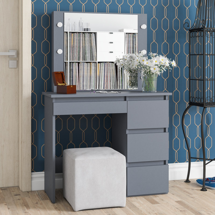 Элегантный дизайн и продуманная конструкция делают его удобным и практичным дополнением интерьера. Стол оснащен широкой панелью с зеркалом, которое обеспечивает комфортное отражение для нанесения макияжа. По бокам от зеркала предусмотрены отверстия для установки подсветки (по три с каждой стороны), что создаёт качественное освещение без теней.