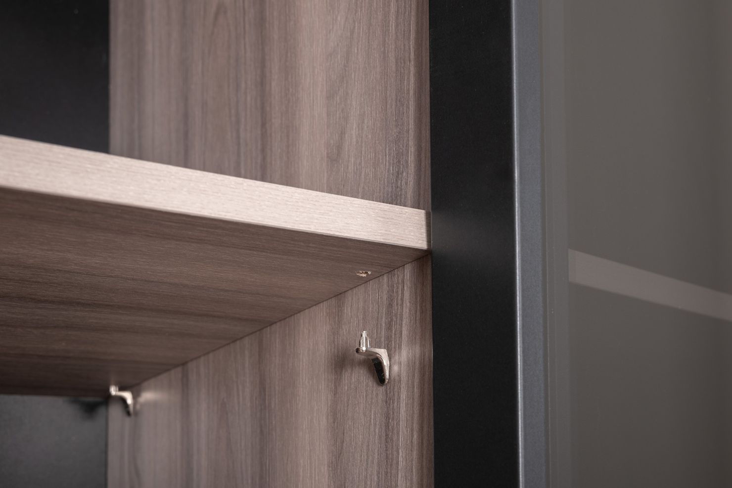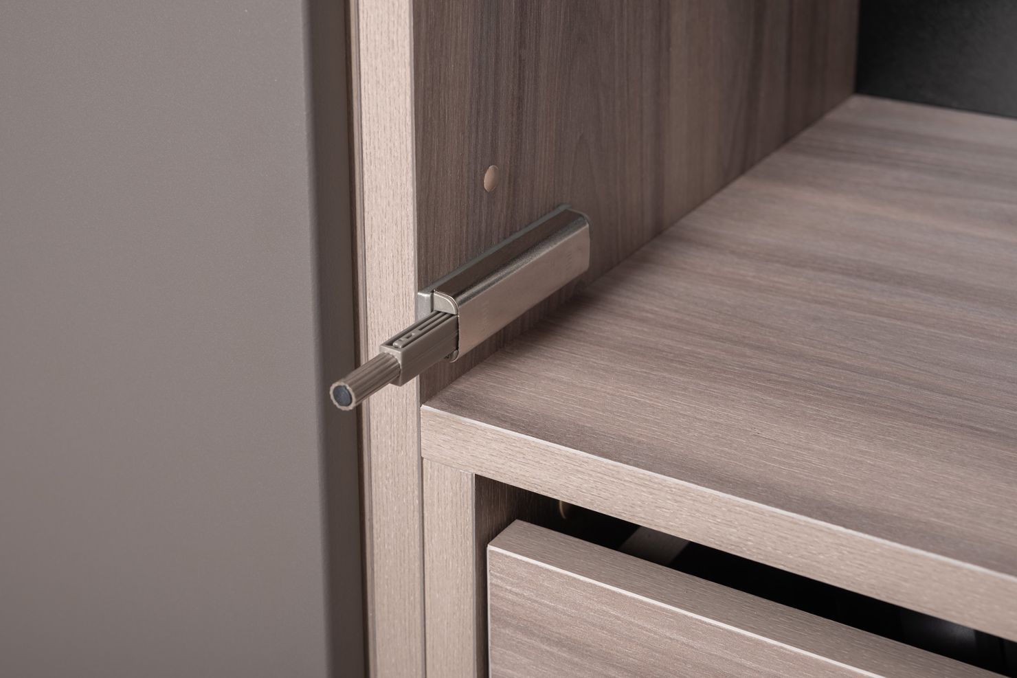 За дверкой полки для хранения. Распашной фасад с механизмом push-to-open.