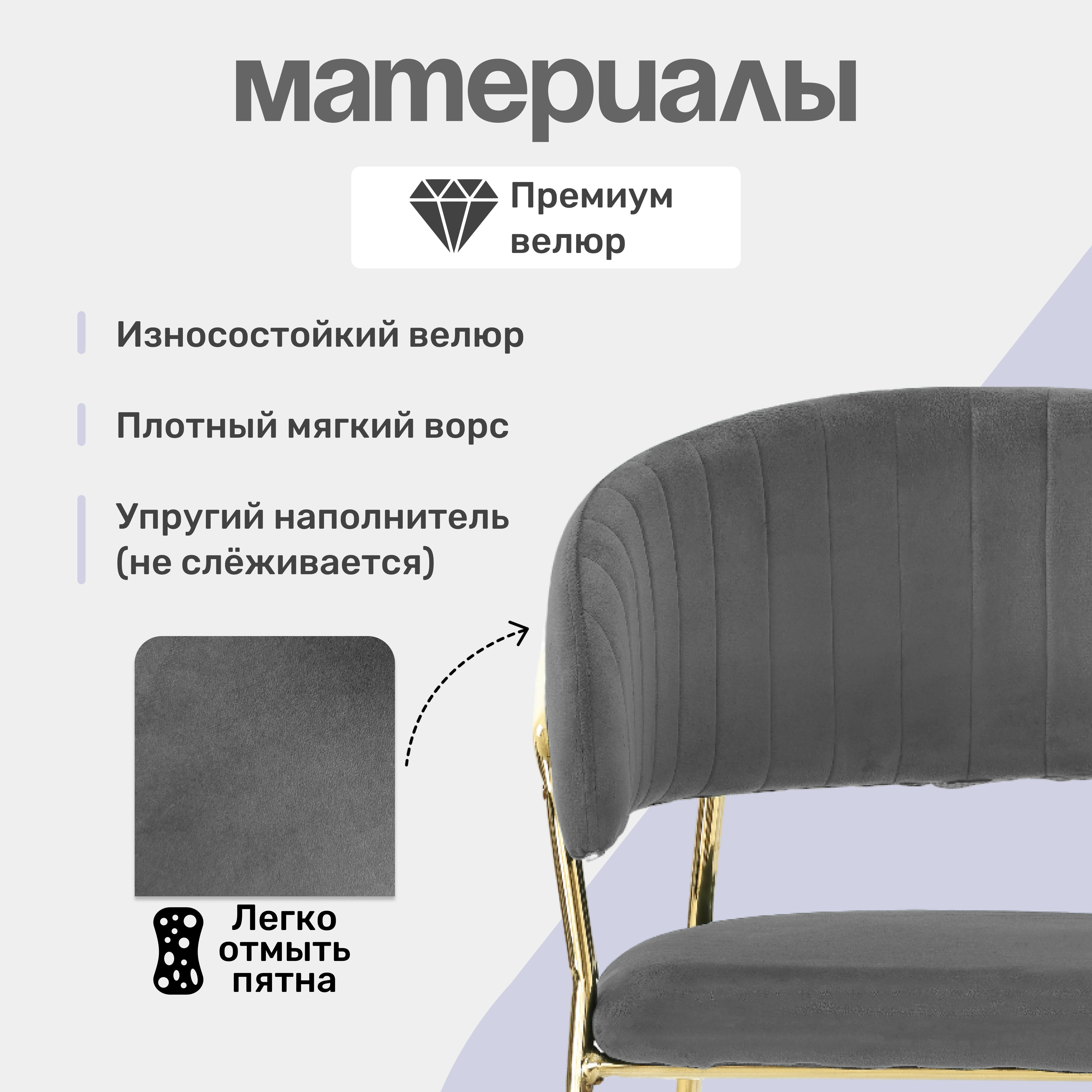 Кресло выполнено с золотистыми акцентами, что придает ему изысканный и современный вид. Обивка из велюра, обеспечивает мягкость и комфорт при использовании.