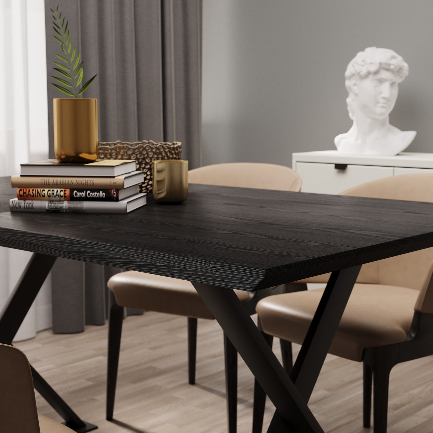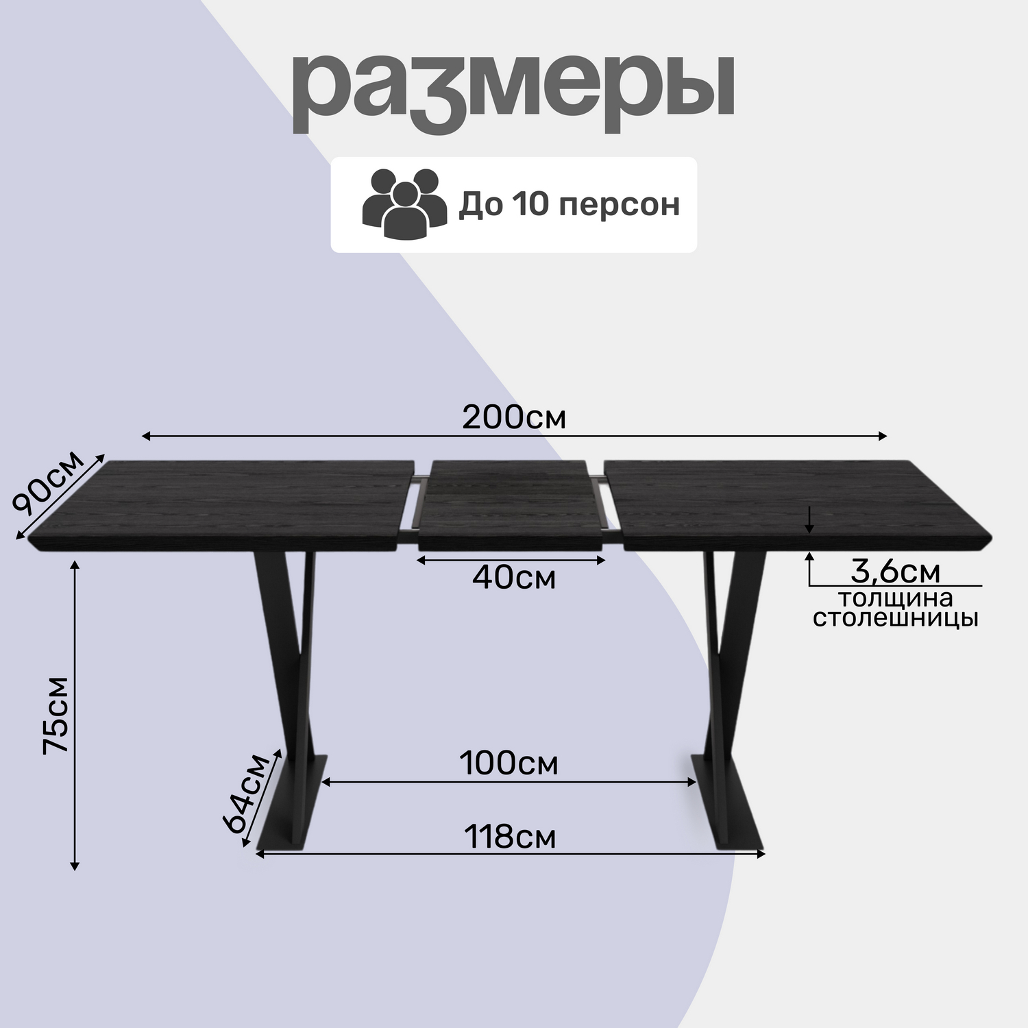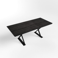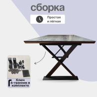 Высота стола достигает 75 см, что обеспечивает комфорт при использовании. Столешница толщиной 3,6 см выполнена из качественного МДФ, а насыщенный чёрный цвет с текстурой дерева добавляет элегантности и тепла, создавая уютную атмосферу для семейных встреч и подчеркивая ее современный вид. Подстолье, выполненное из матового металла, обеспечивает надежную опору и устойчивость конструкции. Ножки стола, изящно оформленные в форме песочных часов, добавляют нотку оригинальности и утонченности.