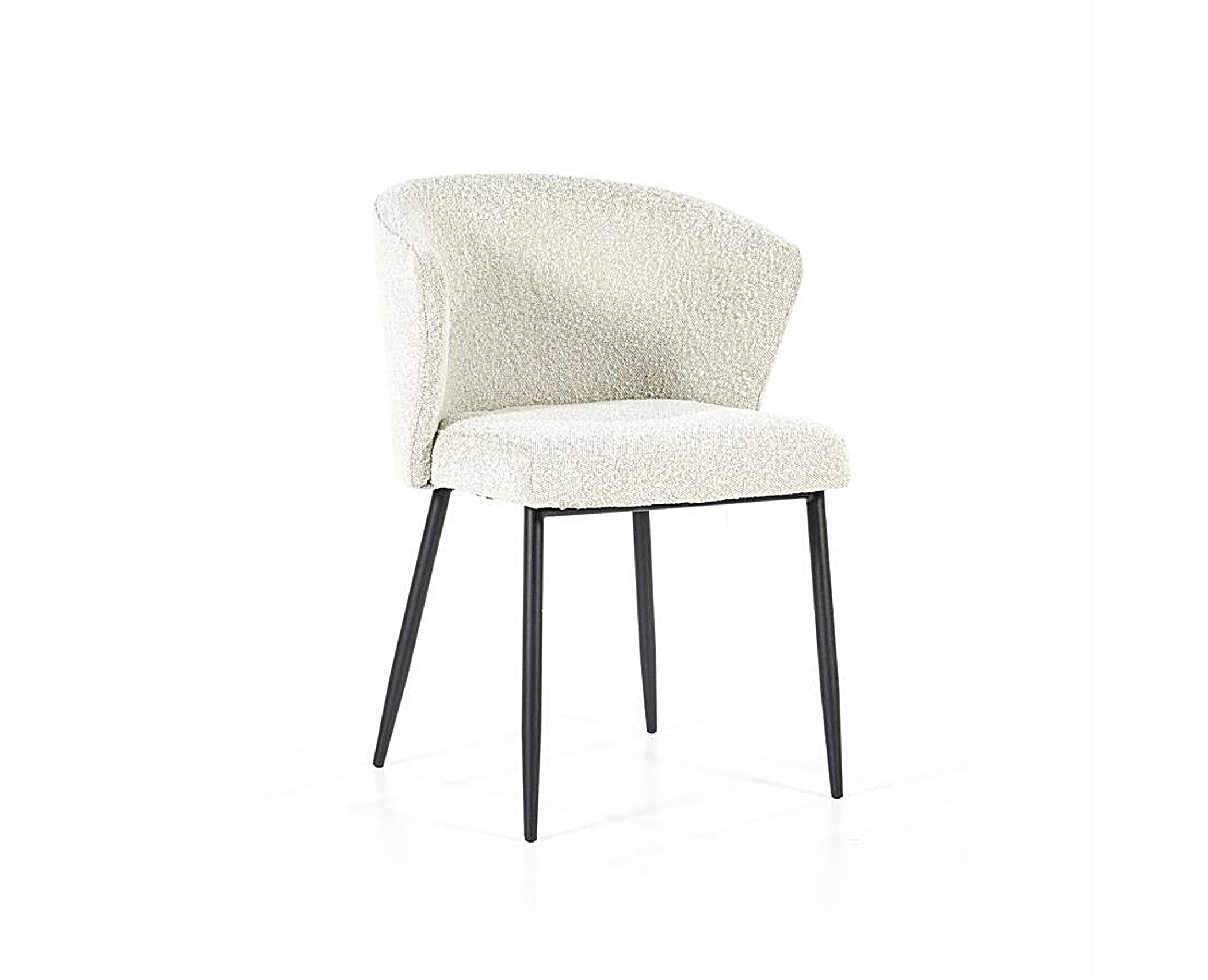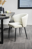 Обивка стула выполнена из высококачественного букле белого цвета, который не только придаёт стулу изысканный вид, но и обеспечивает комфорт и тепло при использовании. Ножки стула из прочного черного металла гарантируют надежность и стабильность, создавая великолепный контраст с мягкой обивкой.