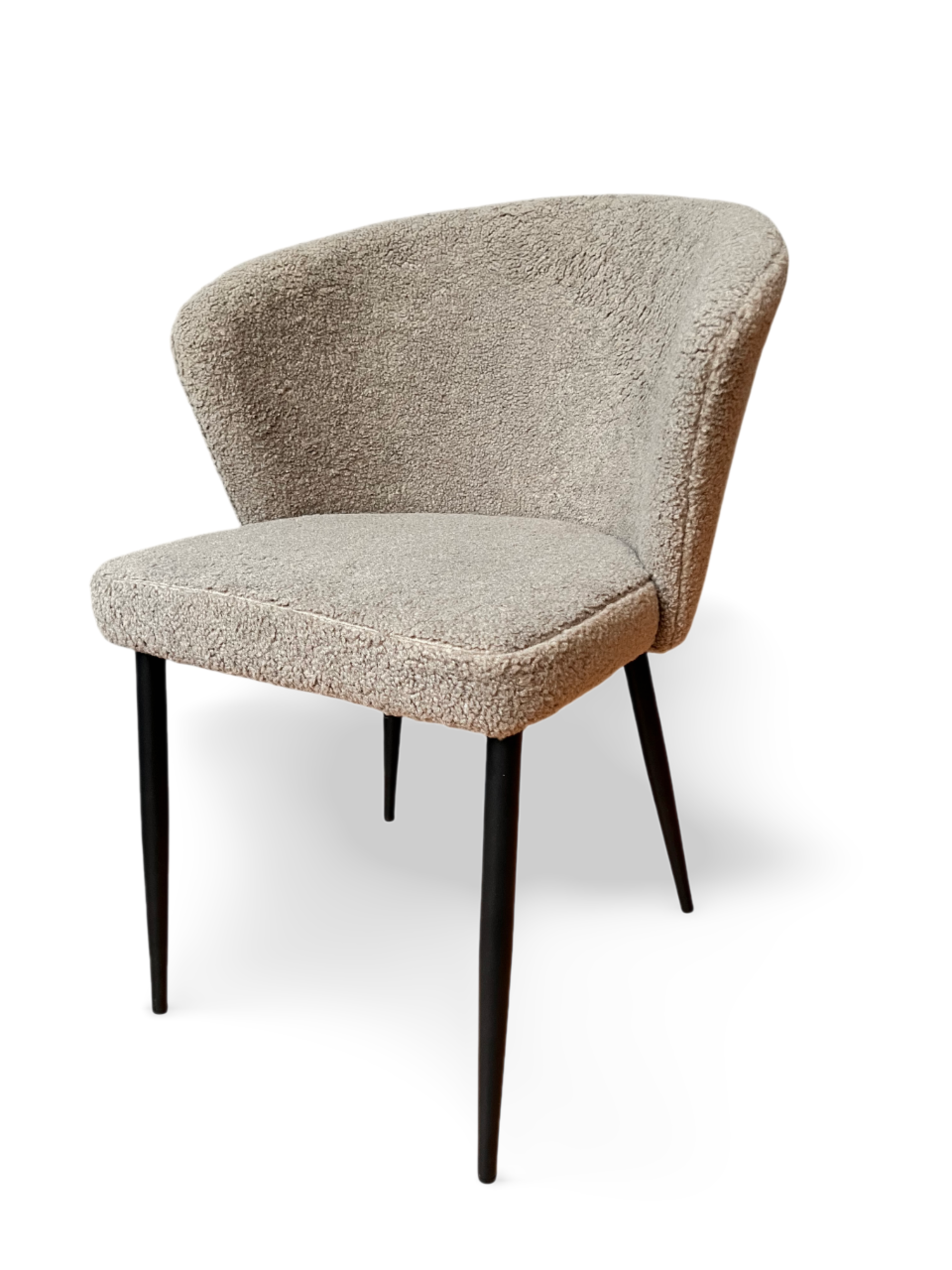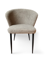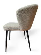Обивка стула выполнена из высококачественного букле белого цвета, который не только придаёт стулу изысканный вид, но и обеспечивает комфорт и тепло при использовании. Ножки стула из прочного черного металла гарантируют надежность и стабильность, создавая великолепный контраст с мягкой обивкой.