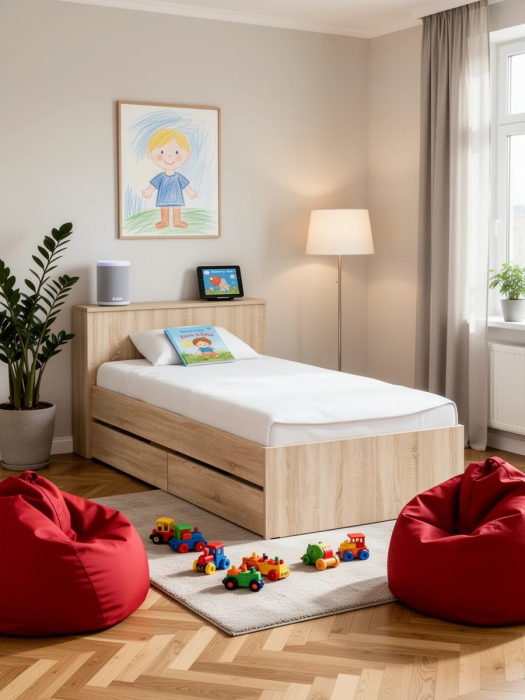 Компактная и продуманная конструкция идеально подходит как для детской, так и для небольшой спальни, гармонично сочетая стильный дизайн и высокую функциональность. Кровать имеет односпальное место 900×2000 мм с прочным основанием в комплекте. Матрас приобретается отдельно, позволяя выбрать оптимальный уровень жесткости и комфорта. В основании кровати предусмотрены два ящика на роликовых направляющих, которые обеспечивают легкое и бесшумное выдвижение. Это идеальное решение для хранения постельного белья, сезонной одежды или других вещей. Дополнительно в изголовье предусмотрена откидная панель с нишей, которая отлично подойдет для хранения книг, гаджетов и прочих мелочей, создавая удобное пространство для вечернего отдыха. Кровать имеет универсальную сборку, что позволяет расположить выдвижные ящики как с левой, так и с правой стороны, в зависимости от планировки комнаты.