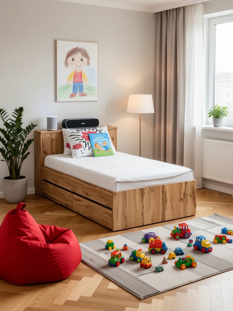 Компактная и продуманная конструкция идеально подходит как для детской, так и для небольшой спальни, гармонично сочетая стильный дизайн и высокую функциональность. Кровать имеет односпальное место 900×2000 мм с прочным основанием в комплекте. Матрас приобретается отдельно, позволяя выбрать оптимальный уровень жесткости и комфорта. В основании кровати предусмотрены два ящика на роликовых направляющих, которые обеспечивают легкое и бесшумное выдвижение. Это идеальное решение для хранения постельного белья, сезонной одежды или других вещей. Дополнительно в изголовье предусмотрена откидная панель с нишей, которая отлично подойдет для хранения книг, гаджетов и прочих мелочей, создавая удобное пространство для вечернего отдыха. Кровать имеет универсальную сборку, что позволяет расположить выдвижные ящики как с левой, так и с правой стороны, в зависимости от планировки комнаты.