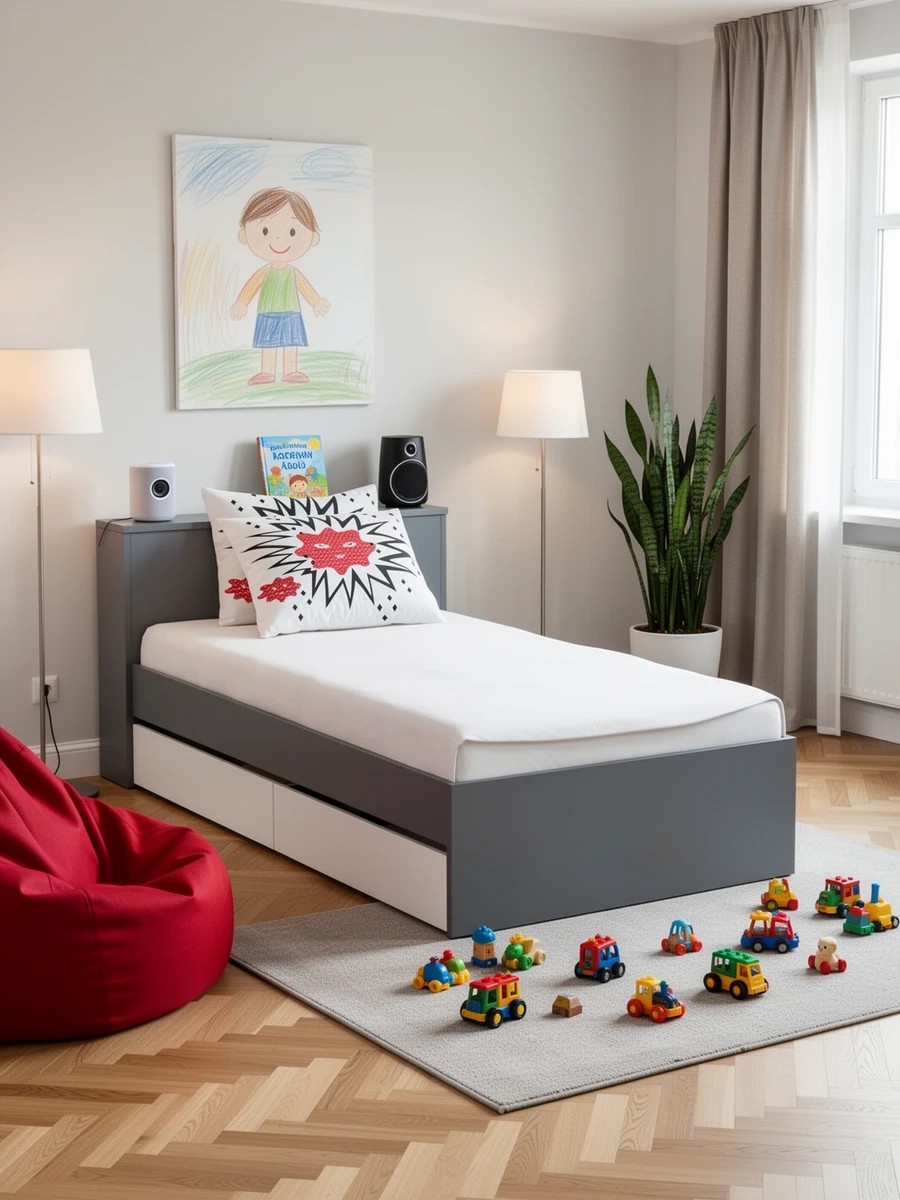 Компактная и продуманная конструкция идеально подходит как для детской, так и для небольшой спальни, гармонично сочетая стильный дизайн и высокую функциональность. Кровать имеет односпальное место 900×2000 мм с прочным основанием в комплекте. Матрас приобретается отдельно, позволяя выбрать оптимальный уровень жесткости и комфорта. В основании кровати предусмотрены два ящика на роликовых направляющих, которые обеспечивают легкое и бесшумное выдвижение. Это идеальное решение для хранения постельного белья, сезонной одежды или других вещей. Дополнительно в изголовье предусмотрена откидная панель с нишей, которая отлично подойдет для хранения книг, гаджетов и прочих мелочей, создавая удобное пространство для вечернего отдыха. Кровать имеет универсальную сборку, что позволяет расположить выдвижные ящики как с левой, так и с правой стороны, в зависимости от планировки комнаты.
