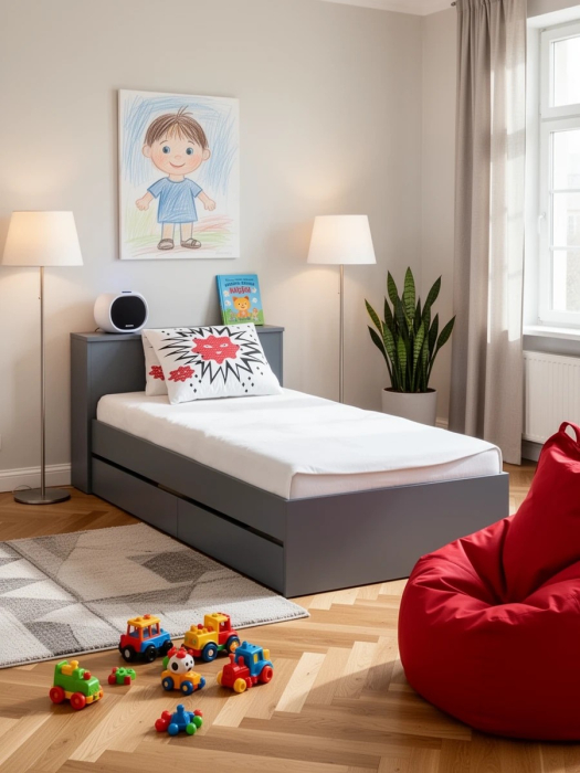 Компактная и продуманная конструкция идеально подходит как для детской, так и для небольшой спальни, гармонично сочетая стильный дизайн и высокую функциональность. Кровать имеет односпальное место 900×2000 мм с прочным основанием в комплекте. Матрас приобретается отдельно, позволяя выбрать оптимальный уровень жесткости и комфорта. В основании кровати предусмотрены два ящика на роликовых направляющих, которые обеспечивают легкое и бесшумное выдвижение. Это идеальное решение для хранения постельного белья, сезонной одежды или других вещей. Дополнительно в изголовье предусмотрена откидная панель с нишей, которая отлично подойдет для хранения книг, гаджетов и прочих мелочей, создавая удобное пространство для вечернего отдыха. Кровать имеет универсальную сборку, что позволяет расположить выдвижные ящики как с левой, так и с правой стороны, в зависимости от планировки комнаты.