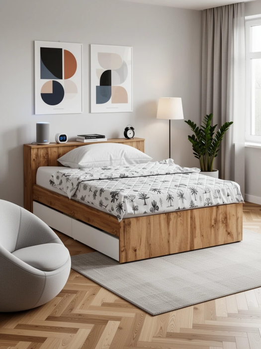Кровать имеет односпальное место 1200×2000 мм с прочным основанием в комплекте. Матрас приобретается отдельно, позволяя выбрать оптимальный уровень жесткости и комфорта.