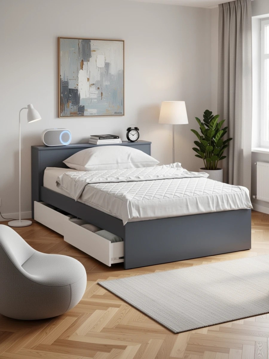В основании кровати предусмотрены два ящика на роликовых направляющих, которые обеспечивают легкое и бесшумное выдвижение.