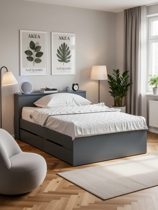 Кровать имеет односпальное место 1200×2000 мм с прочным основанием в комплекте. Матрас приобретается отдельно, позволяя выбрать оптимальный уровень жесткости и комфорта.