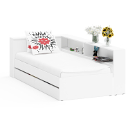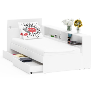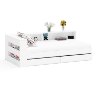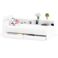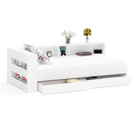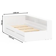 Компактная и продуманная конструкция идеально подходит как для детской, так и для небольшой спальни, гармонично сочетая стильный дизайн и высокую функциональность. Кровать имеет односпальное место 900×2000 мм с прочным основанием в комплекте. Матрас приобретается отдельно, позволяя выбрать оптимальный уровень жесткости и комфорта. В основании кровати предусмотрены два ящика на роликовых направляющих, которые обеспечивают легкое и бесшумное выдвижение. Это идеальное решение для хранения постельного белья, сезонной одежды или других вещей.