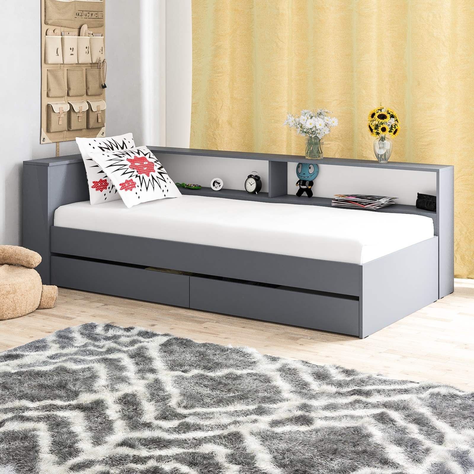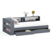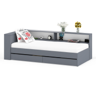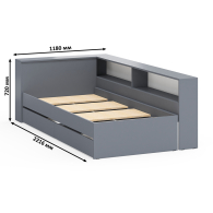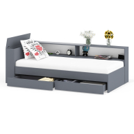 Компактная и продуманная конструкция идеально подходит как для детской, так и для небольшой спальни, гармонично сочетая стильный дизайн и высокую функциональность. Кровать имеет односпальное место 900×2000 мм с прочным основанием в комплекте. Матрас приобретается отдельно, позволяя выбрать оптимальный уровень жесткости и комфорта. В основании кровати предусмотрены два ящика на роликовых направляющих, которые обеспечивают легкое и бесшумное выдвижение. Это идеальное решение для хранения постельного белья, сезонной одежды или других вещей.