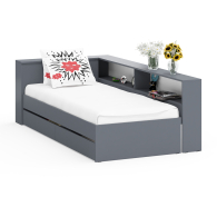 Дополнительно в изголовье предусмотрена откидная панель с нишей, которая отлично подойдет для хранения книг, гаджетов и прочих мелочей, создавая удобное пространство для вечернего отдыха. Кровать имеет универсальную сборку, что позволяет расположить выдвижные ящики как с левой, так и с правой стороны, в зависимости от планировки комнаты. Фасады ящиков выполнены без ручек – удобные выемки обеспечивают простоту использования и добавляют мебели современный минималистичный вид.