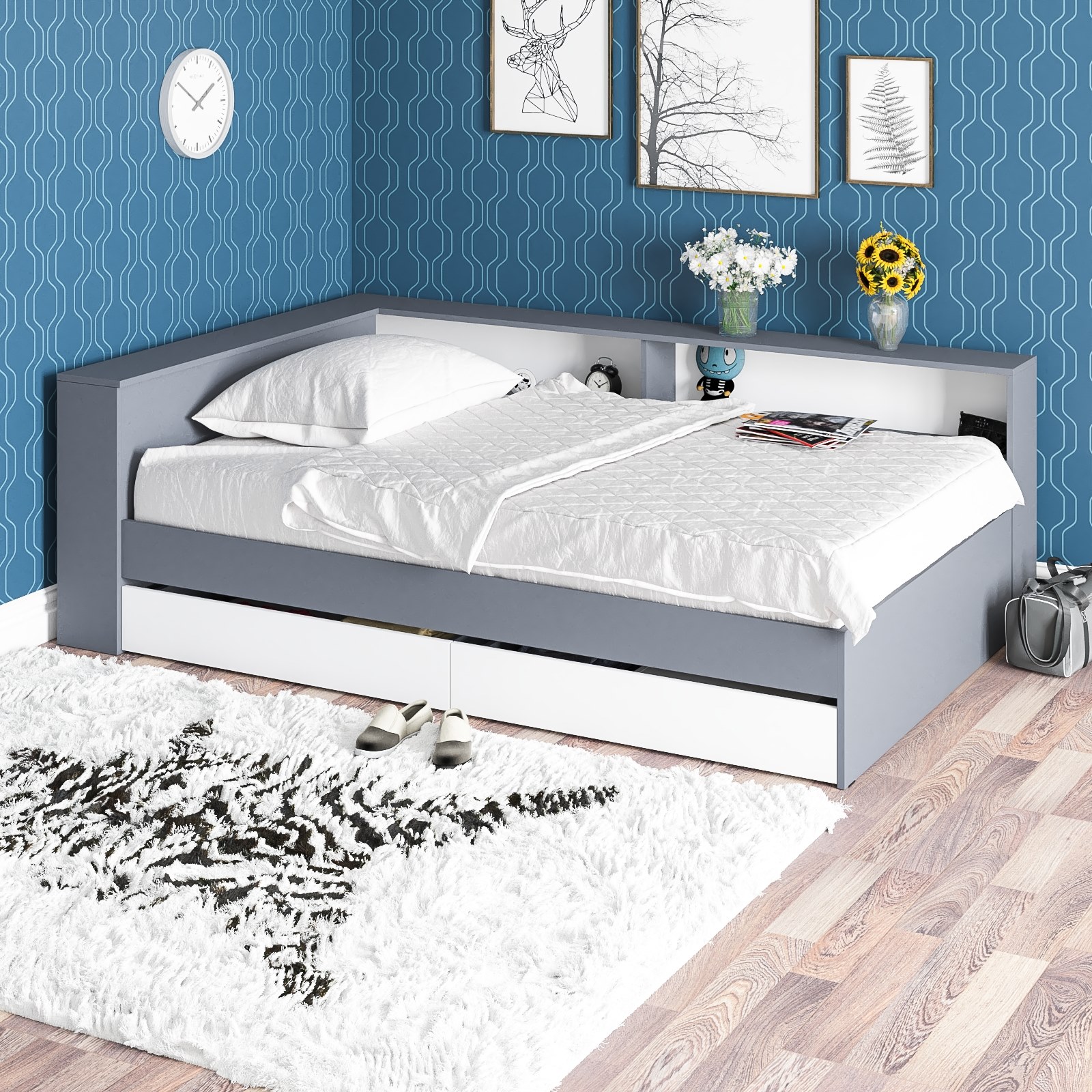 Благодаря выдвижным ящикам, полкам прикроватного блока и удобному отсеку для хранения белья, она поможет организовать пространство и сохранить порядок, а современный лаконичный дизайн гармонично впишется в любой интерьер. Кровать имеет односпальное место 1200×2000 мм с прочным основанием в комплекте. Матрас приобретается отдельно, позволяя выбрать оптимальный уровень жесткости и комфорта. В основании кровати предусмотрены два ящика на роликовых направляющих, которые обеспечивают легкое и бесшумное выдвижение. Это идеальное решение для хранения постельного белья, сезонной одежды или других вещей.