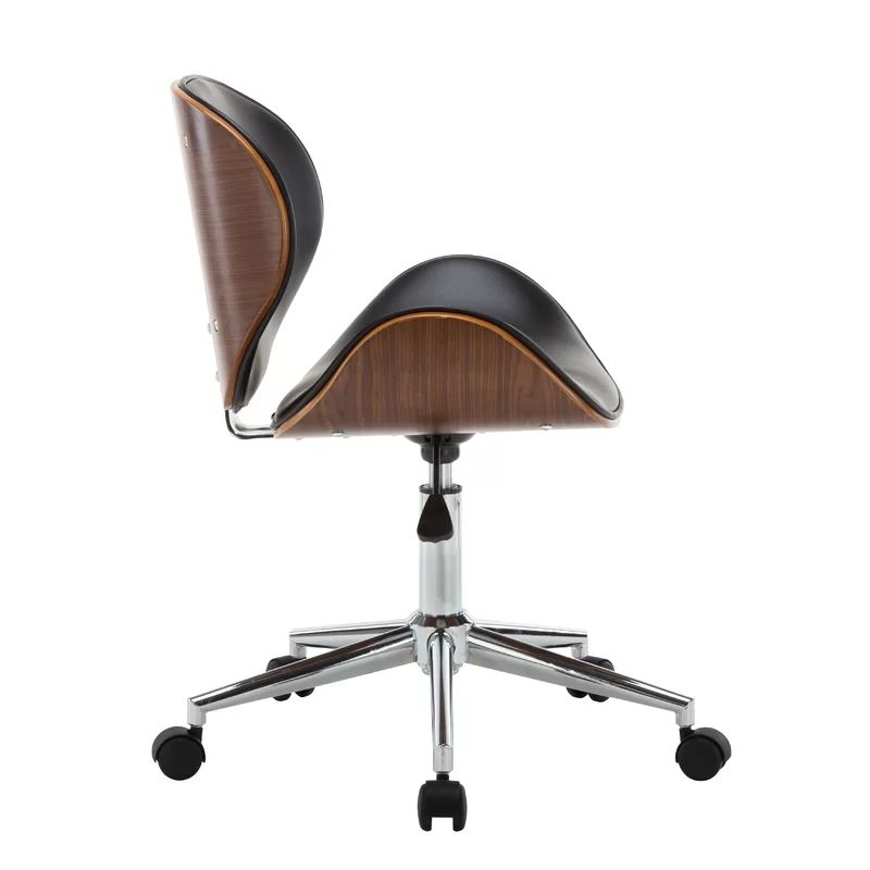 Дизайн и материалы: Корпус кресла выполнен из гнутой тонированной фанеры в благородном коричневом цвете, что придает ему изысканный и современный вид. Обивка из черной искусственной кожи добавляет креслу сдержанную роскошь, делая его универсальным для любого интерьера.