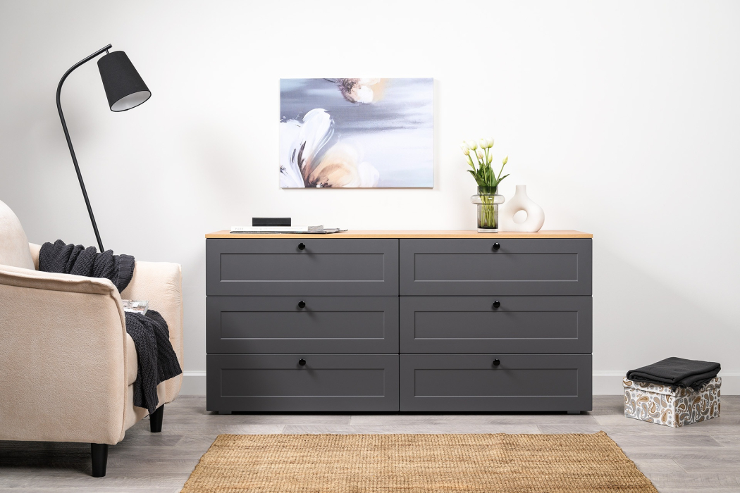 Комод оснащен шестью вместительными выдвижными ящиками на шариковых направляющих полного выдвижения. Размер каждого ящика — 726×336 мм, высота — 110 мм, полезная глубина — 33 см, что обеспечивает удобство хранения различных вещей. Эргономичные чёрные ручки из прочного пластика придают модели строгий и современный вид, подчёркивая стиль всей коллекции. Пластиковые опоры с регулировкой по высоте обеспечивают устойчивость комода даже на неровных поверхностях, сохраняя напольное покрытие от повреждений.