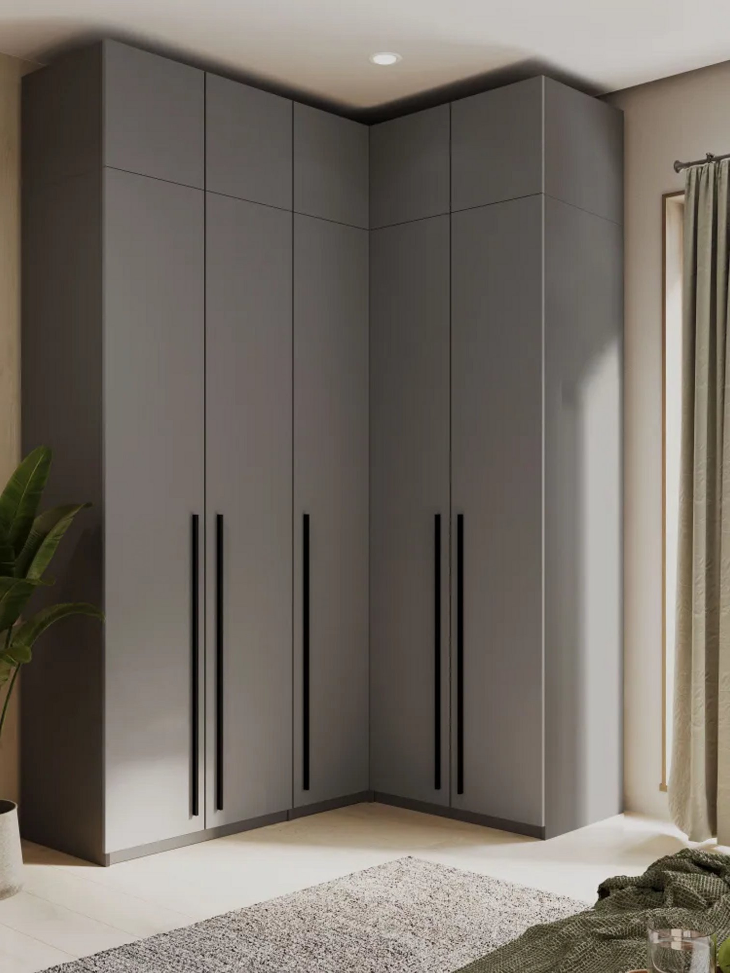 Конструкция этого распашного шкафа включает два двери и практичные ящики, которые позволят удобно хранить одежду, обувь и аксессуары. Угловой шкаф обеспечивает максимальный доступ к хранению вещей, что делает его функциональным и удобным.