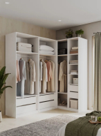 Обладая габаритами 2200х2100х1300 мм, этот угловой шкаф помогает эффективно использовать пространство, идеально подходя для уголков комнаты. Две распашные двери обеспечивают легкий доступ к одежде. Внутреннее пространство организовано разумно: здесь есть несколько полок для одежды и ящики, которые идеально подходят для хранения мелочей.