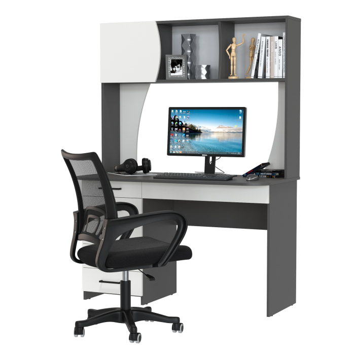 Оснащён широкой столешницей 121х61 см, которая вмещает всё необходимое: канцтовары, ноутбук, документы и даже монитор до 48 дюймов. Надстройка включает две открытые ниши и одну за распашной дверцей — удобно для книг, папок и мелкой техники. Под столешницей — выдвижной ящик справа и тумба с пятью ящиками слева, обеспечивающие порядок и организованность. Эргономичная рабочая зона способствует концентрации и продуктивности. Сборка не универсальная - под столешницей выдвижной ящик справа и тумба с пятью ящичками слева. Кресло компьютерное — это современное и удобное решение для организации рабочего места, будь то дом, офис или учебная зона. Сиденье с обивкой из сетки и текстиля с мягким поролоновым наполнителем — комфорт на весь день. Упругая дышащая спинка обеспечивает отличную вентиляцию, особенно летом.