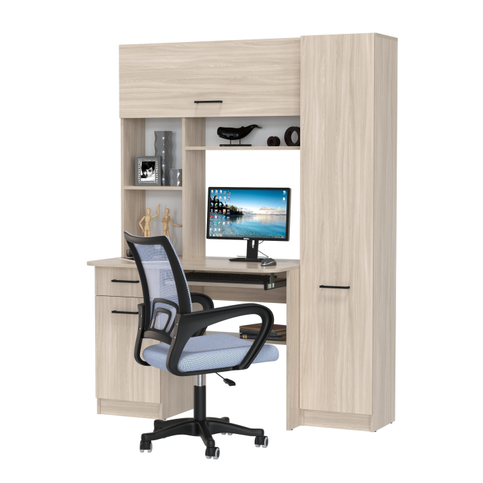 Стол сочетает в себе однотумбовую конструкцию с вместительной надстройкой и пеналом, предоставляя всё необходимое для удобной организации пространства. Широкая столешница оснащена выдвижной полкой для клавиатуры, а продуманное расположение полок и ящиков позволяет держать книги, документы и канцтовары всегда под рукой. Надстройка выполнена в виде стеллажа с открытыми и закрытыми отделениями. Универсальная схема сборки даёт возможность разместить тумбу и пенал по желанию — с любой стороны.