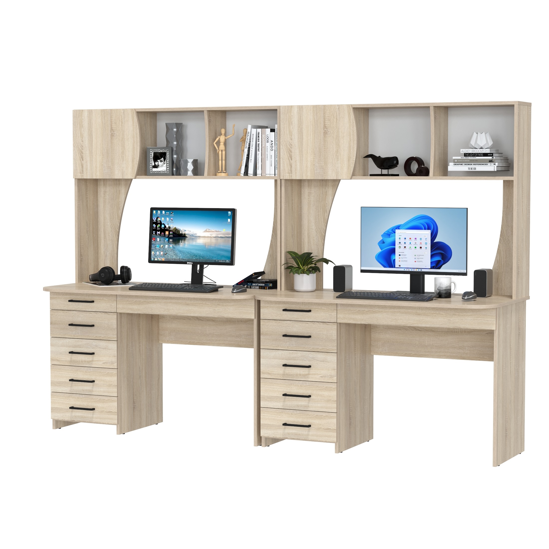 Практичные и функциональные столы подойдут как взрослым, так и детям, обеспечивая комфортное рабочее пространство. Компактные размеры и универсальный дизайн делают эти столы идеальными для дома или офиса. Каждый стол оснащён широкой столешницей, вместительной надстройкой и тумбой с ящиками, что делает его удобным и организованным. Эргономичная зона каждого стола способствует продуктивной работе и эффективным занятиям. Столешницы вмещают канцтовары, документы, учебники, ноутбук или монитор до 48 дюймов, что позволяет организовать пространство для всех нужных предметов. На каждой столешнице установлена надстройка с двумя открытыми нишами и одной нишей за распашной дверцей. Полки надстроек идеально подходят для хранения книг, папок и мелкой техники, что помогает поддерживать порядок.