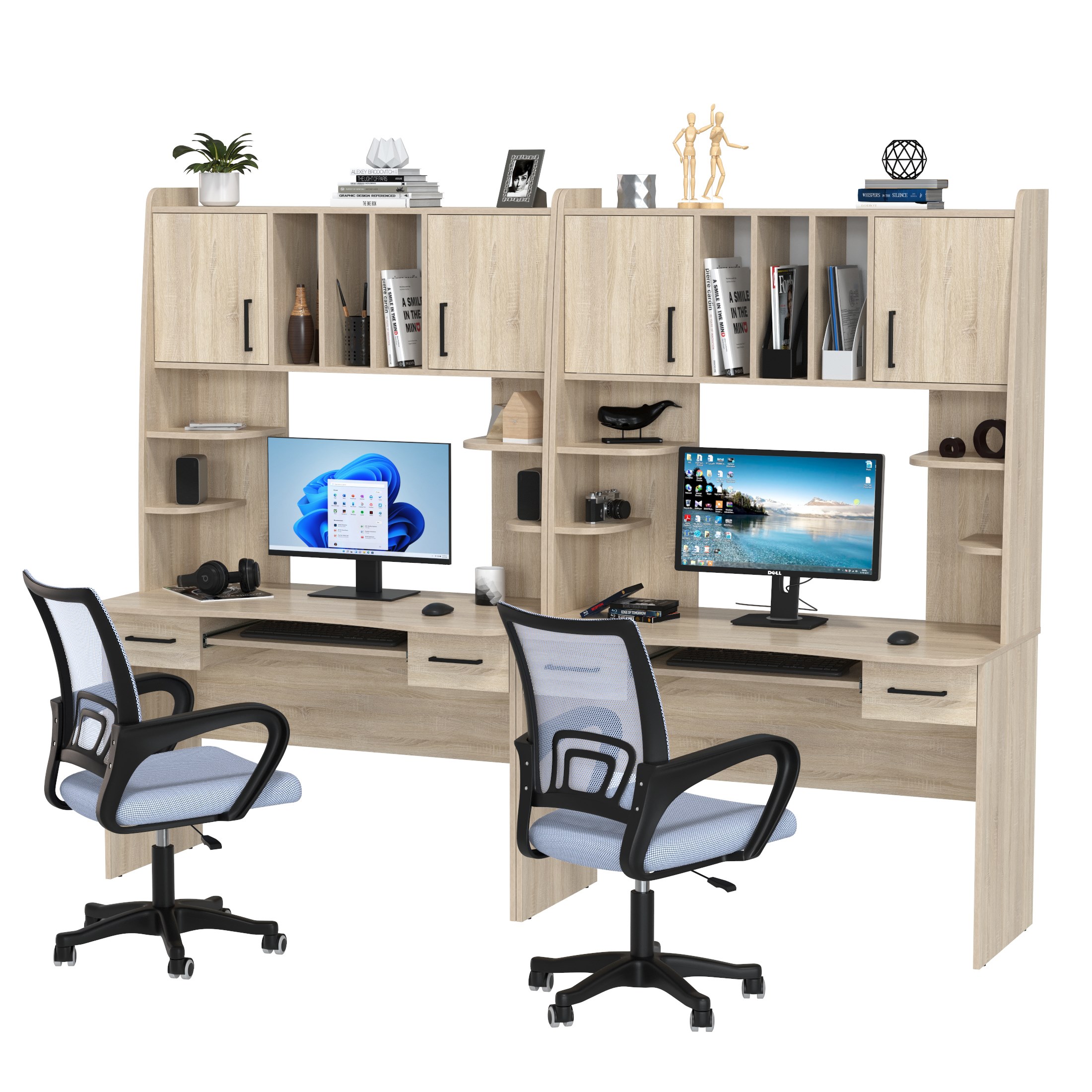 Каждый стол оборудован надстройкой с двумя закрытыми отделениями, открытыми полками и нишами с перегородками, что обеспечивает удобное хранение книг, документов и аксессуаров. Столешницы с плавно закруглёнными краями обеспечивают безопасность и комфорт при использовании, а также достаточно широки для размещения мониторов или ноутбуков. Под каждой столешницей предусмотрены выдвижные ящики для канцелярии и полки для клавиатуры — всё продумано для эргономичной и организованной работы.