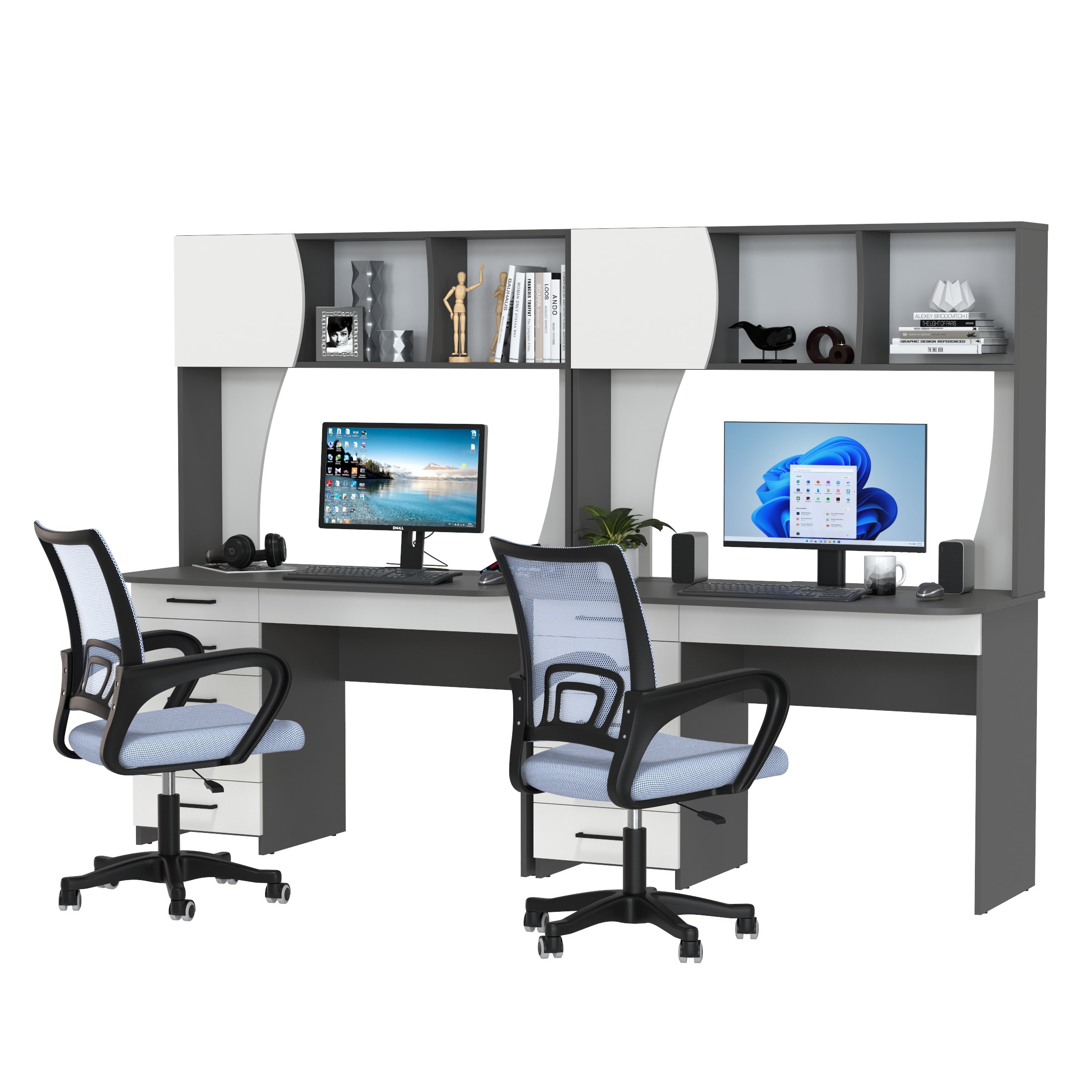 Два компьютерных кресла 103 в комплекте выполнены в сером цвете и обеспечивают высокий уровень комфорта даже при длительном использовании.