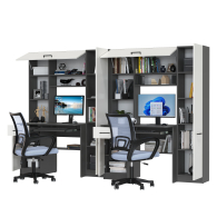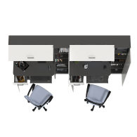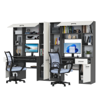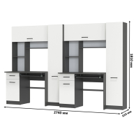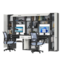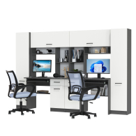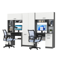 Каждое рабочее место включает однотумбовый компьютерный стол с надстройкой и пеналом, обеспечивая достаточное пространство для учебы, работы и хранения. Надстройки с открытыми полками идеально подходят для размещения книг, ноутбуков, аксессуаров и предметов декора, делая организацию пространства максимально удобной. Каждый стол оборудован выдвижной полкой для клавиатуры, вместительным ящиком и отделением с полкой за распашной дверцей, что помогает поддерживать порядок и экономить место. Гибкая универсальная сборка позволяет настраивать расположение тумб и пеналов в зависимости от потребностей и особенностей помещения.