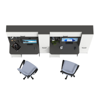 Комплект из двух рабочих столов Альфа с надстройками и двумя серыми компьютерными креслами — отличное решение для создания комфортной и функциональной рабочей зоны на двоих.