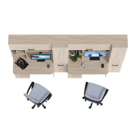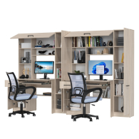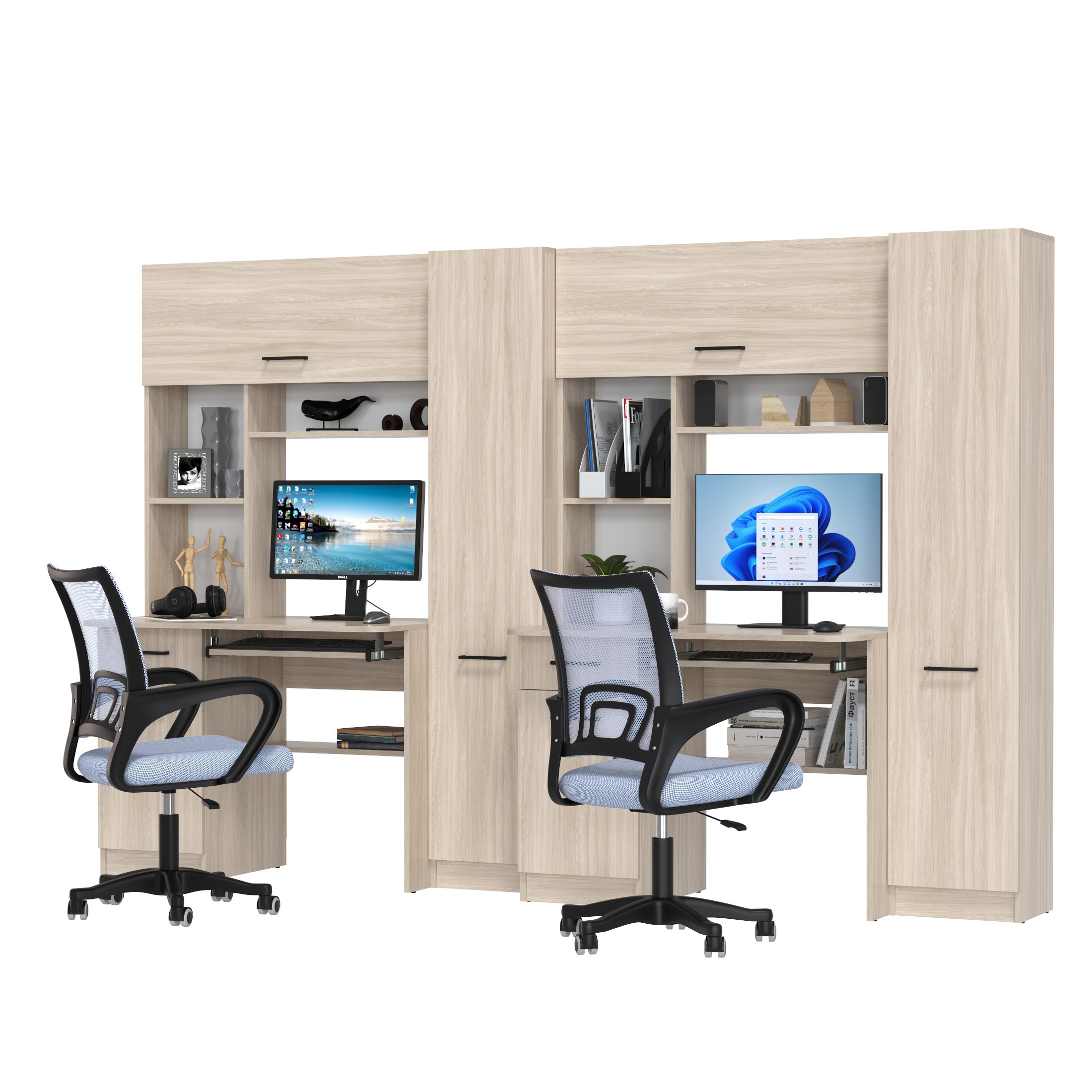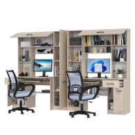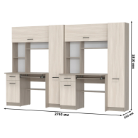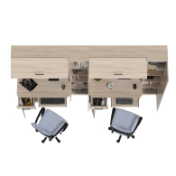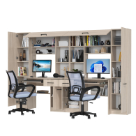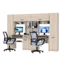 Каждое рабочее место включает однотумбовый компьютерный стол с надстройкой и пеналом, обеспечивая достаточное пространство для учебы, работы и хранения. Надстройки с открытыми полками идеально подходят для размещения книг, ноутбуков, аксессуаров и предметов декора, делая организацию пространства максимально удобной. Каждый стол оборудован выдвижной полкой для клавиатуры, вместительным ящиком и отделением с полкой за распашной дверцей, что помогает поддерживать порядок и экономить место. Гибкая универсальная сборка позволяет настраивать расположение тумб и пеналов в зависимости от потребностей и особенностей помещения.