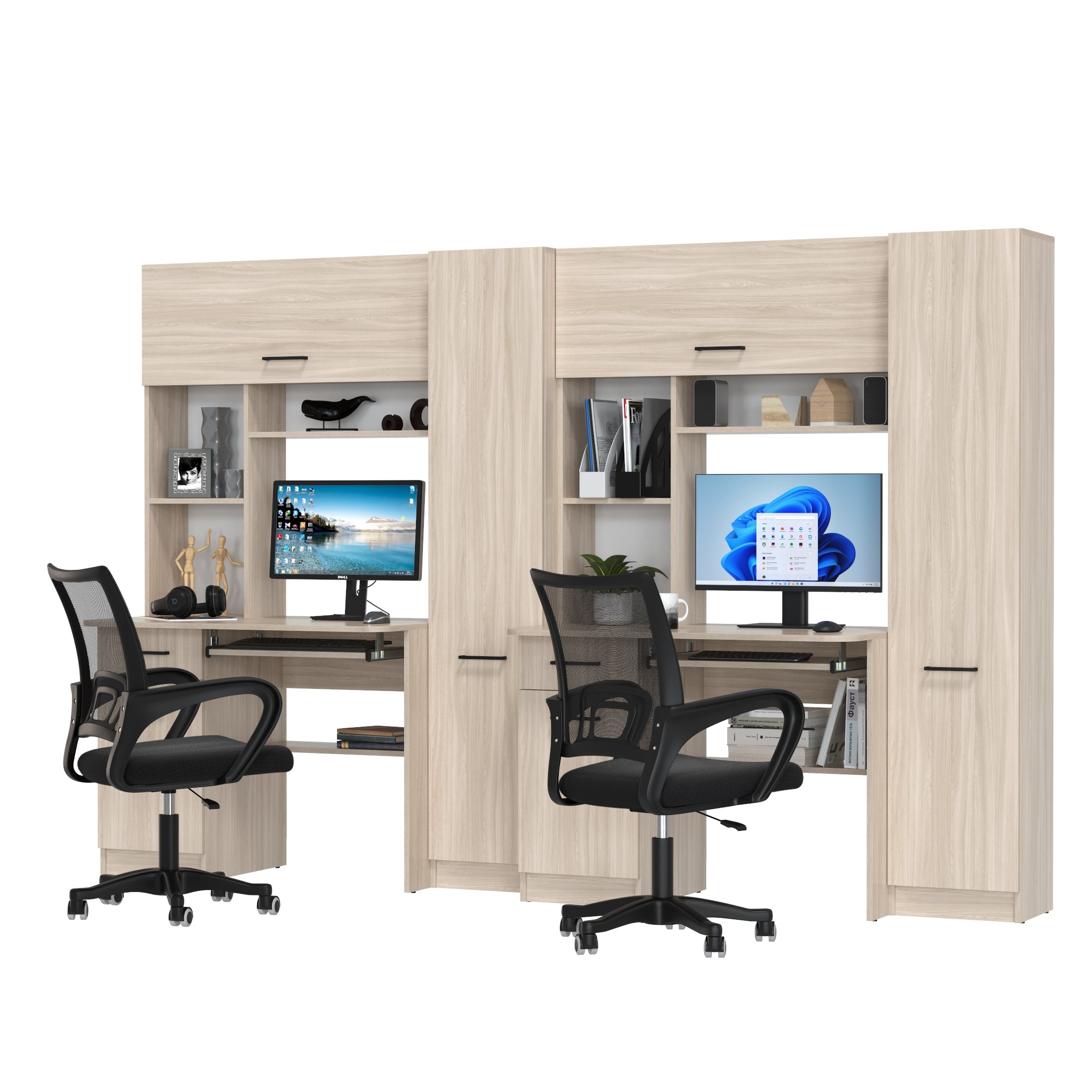 Каждое рабочее место включает однотумбовый компьютерный стол с надстройкой и пеналом, обеспечивая достаточное пространство для учебы, работы и хранения. Надстройки с открытыми полками идеально подходят для размещения книг, ноутбуков, аксессуаров и предметов декора, делая организацию пространства максимально удобной. Каждый стол оборудован выдвижной полкой для клавиатуры, вместительным ящиком и отделением с полкой за распашной дверцей, что помогает поддерживать порядок и экономить место. Гибкая универсальная сборка позволяет настраивать расположение тумб и пеналов в зависимости от потребностей и особенностей помещения.