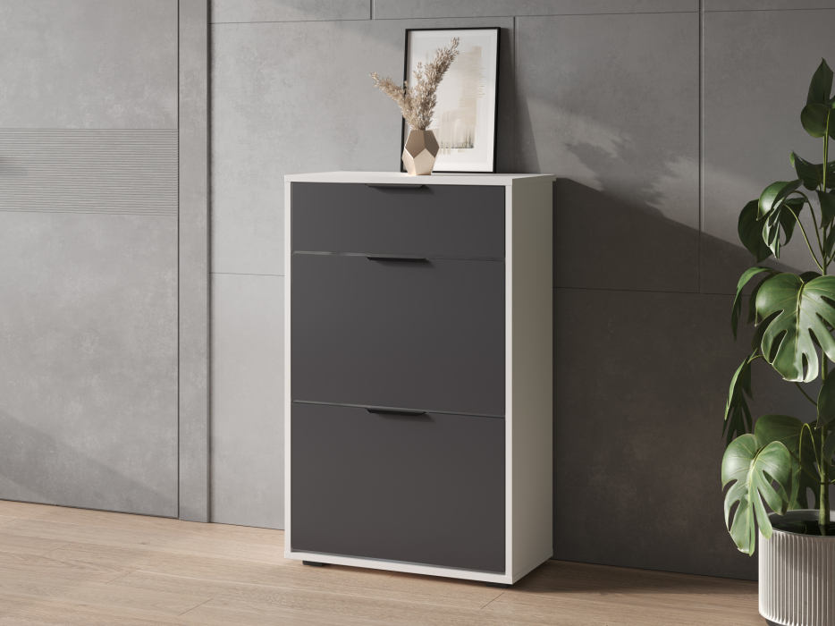 Тумба для обуви Оптима ОП-09 — это идеальный выбор для обустройства прихожей или гардеробной. Ее компактные размеры и продуманная конструкция помогут организовать пространство и сохранить порядок. Основные характеристики: Размеры: 602х970х315 мм (ширина/высота/глубина). Цвета: белый структурный/графит — сочетание современного дизайна и практичности. Материалы: корпус из ЛДСП 16 мм, фасады из МДФ 16 мм. Преимущества тумбы Оптима ОП-09: Функциональность: полки за распашными дверьми и выдвижной ящик для мелочей. Вмещается до 8 пар обуви. Удобство использования: свес крышки на 25 мм обеспечивает прилегание к стене с любым плинтусом. Качественная фурнитура: металлические ручки, телескопические направляющие полного выдвижения без доводчиков, регулируемые опоры высотой 20мм. Доставка и сборка: мебель поставляется в разобранном виде, в надежной упаковке, с подробной инструкцией по сборке. Сборка осуществляется самостоятельно или с привлечением специалистов. Рекомендуется монтаж к стене для дополнительной устойчивости.