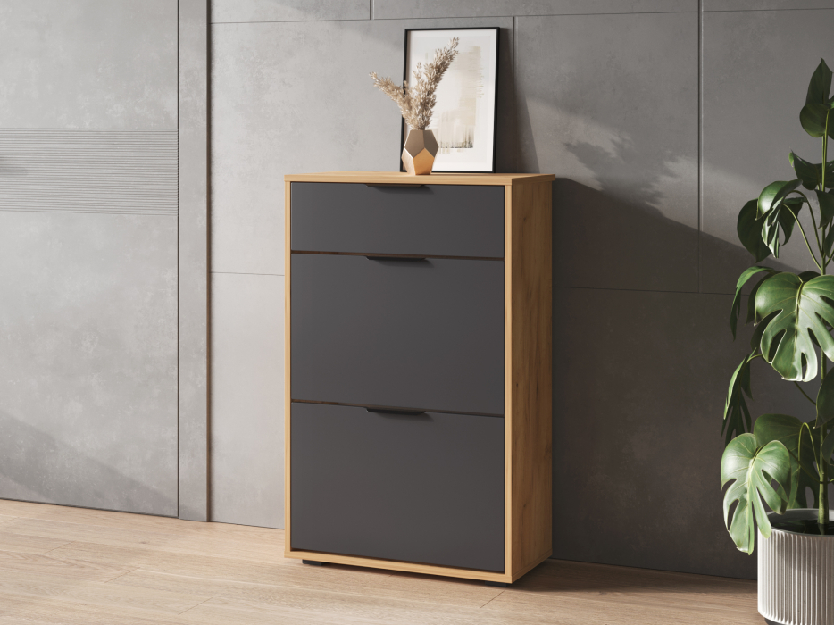 Тумба для обуви Оптима ОП-09 — это идеальный выбор для обустройства прихожей или гардеробной. Ее компактные размеры и продуманная конструкция помогут организовать пространство и сохранить порядок. Основные характеристики: Размеры: 602х970х315 мм (ширина/высота/глубина). Цвета: белый структурный/графит — сочетание современного дизайна и практичности. Материалы: корпус из ЛДСП 16 мм, фасады из МДФ 16 мм. Преимущества тумбы Оптима ОП-09: Функциональность: полки за распашными дверьми и выдвижной ящик для мелочей. Вмещается до 8 пар обуви. Удобство использования: свес крышки на 25 мм обеспечивает прилегание к стене с любым плинтусом. Качественная фурнитура: металлические ручки, телескопические направляющие полного выдвижения без доводчиков, регулируемые опоры высотой 20мм. Доставка и сборка: мебель поставляется в разобранном виде, в надежной упаковке, с подробной инструкцией по сборке. Сборка осуществляется самостоятельно или с привлечением специалистов. Рекомендуется монтаж к стене для дополнительной устойчивости.