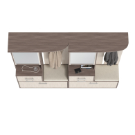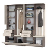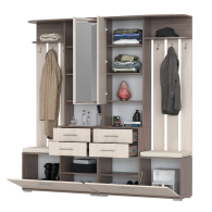 Каждый комбинированный блок прихожей объединяет в себе - открытую вешалку, шкафчик с зеркальной дверцей, удобную тумбу для обуви и банкетку для комфортного переобувания. Открытая вешалка располагает 4-мя крючками и антресольной полочкой для головных уборов. За распашной дверкой зеркального шкафчика притаились три полочки. Не смотря на компактность, шкафчик порадует Вас вместительностью. В двух выдвижных ящичках тумбы достаточно места для нужных под рукой мелочей, ключей, перчаток, крема для обуви или дождевичка. За откидной дверкой тумбы для обуви расположены два отделения, одно для небольшой обуви, разделено горизонтальной полочкой на две части, второе - для высокой обуви. Половина верхнего горизонта тумбы для обуви выполнена в виде банкетки с мягким сиденьем, на которое удобно присесть. Комбинированный блок имеет универсальную сборку - Вы сможете собрать его с максимальным комфортом для себя. Уютная цветовая гамма внесёт в атмосферу дома спокойные интонации и умиротворение.