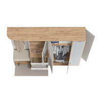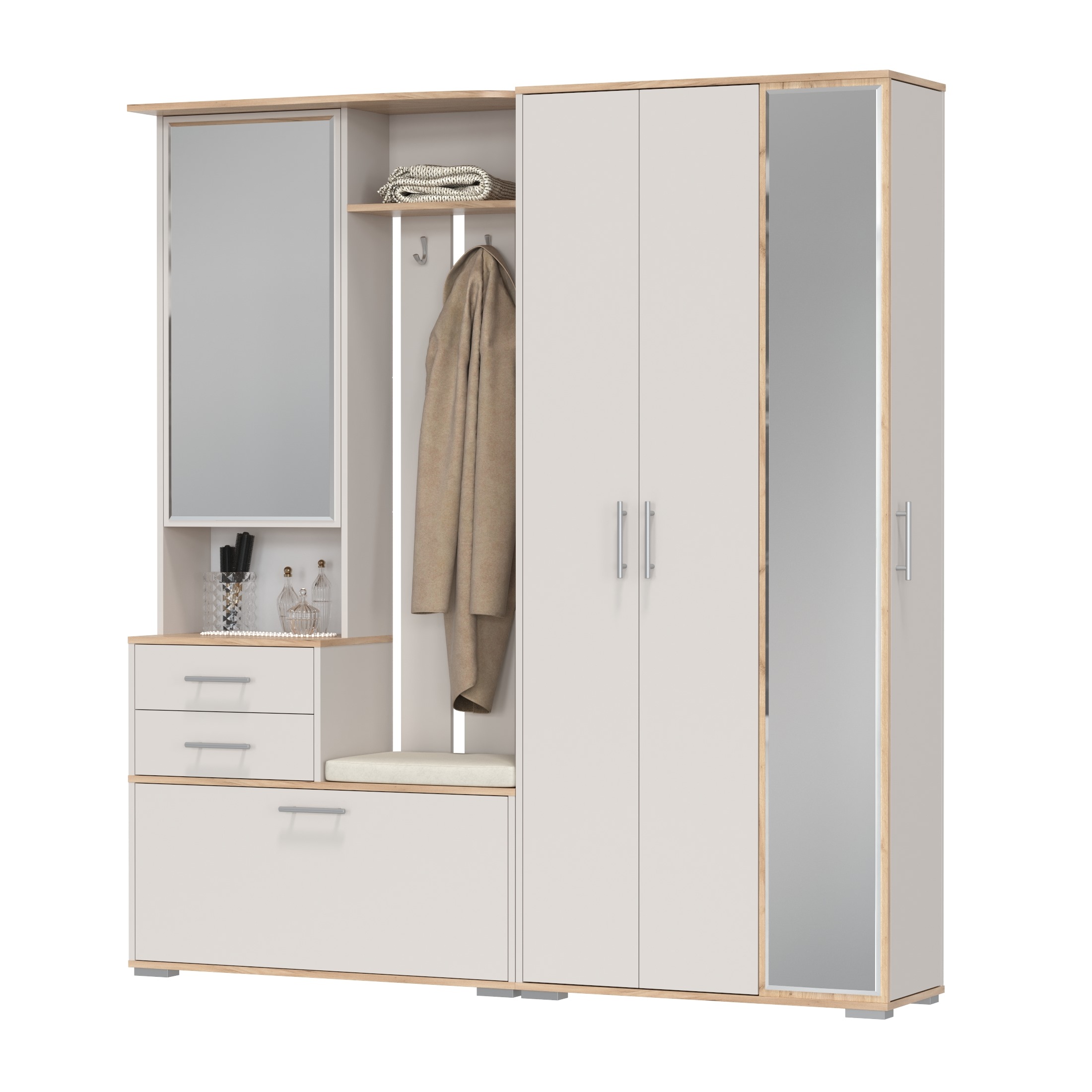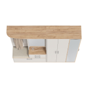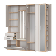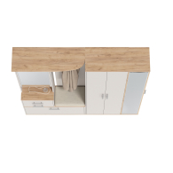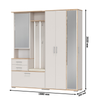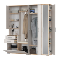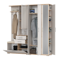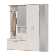 Комбинированный блок прихожей объединяет в себе - открытую вешалку, шкафчик с зеркальной дверцей, удобную тумбу для обуви и банкетку для комфортного переобувания. Открытая вешалка располагает 4-мя крючками и антресольной полочкой для головных уборов. За распашной дверкой зеркального шкафчика притаились три полочки. В двух выдвижных ящичках тумбы достаточно места для нужных под рукой мелочей, ключей, перчаток, крема для обуви или дождевичка. За откидной дверкой тумбы для обуви расположены два отделения, одно для небольшой обуви, разделено горизонтальной полочкой на две части, второе - для высокой обуви. Половина верхнего горизонта тумбы для обуви выполнена в виде банкетки с мягким сиденьем. Комбинированный блок имеет универсальную сборку.