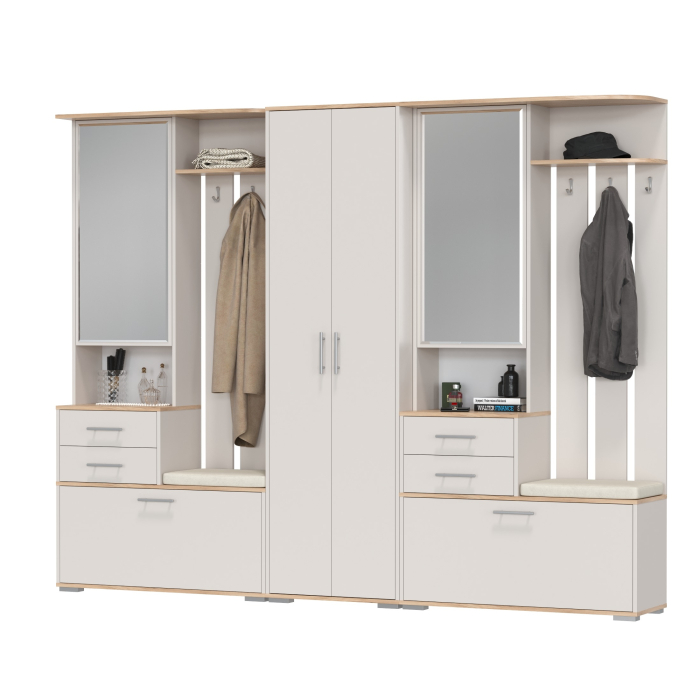 Комплектация состоит из двух мини прихожих и двухстворчатого шкафа, объединенных в единый блок.