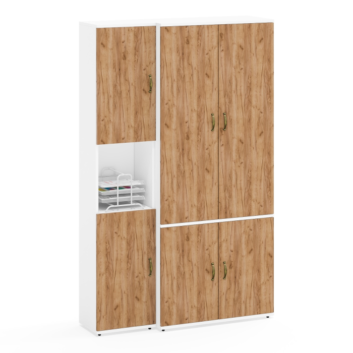 Пенал Пнл оборудован полкой сверху и снизу за распашными дверками и открытой нишей между ними - подходит для хранения книг, документов, создавая аккуратный и стильный вид. Шкаф Ш20Б состоит из двух отделений за распашными дверками. Верхнее отделение - слева – выдвижная штанга, что экономит пространство и облегчает доступ, справа – три полки и открытая ниша снизу, идеально подходящие для хранения аксессуаров, обуви, сумок или декоративных элементов. Нижнее отделение оснащено полкой по центру вещей. Справа – три полки и открытая ниша снизу, подходящие для хранения аксессуаров, обуви, сумок или декоративных элементов. Нижнее отделение оснащено полкой по центру. Сторону открывания дверей пенала вы определяете при сборке. В данной модели шкафа нет универсальной сборки.