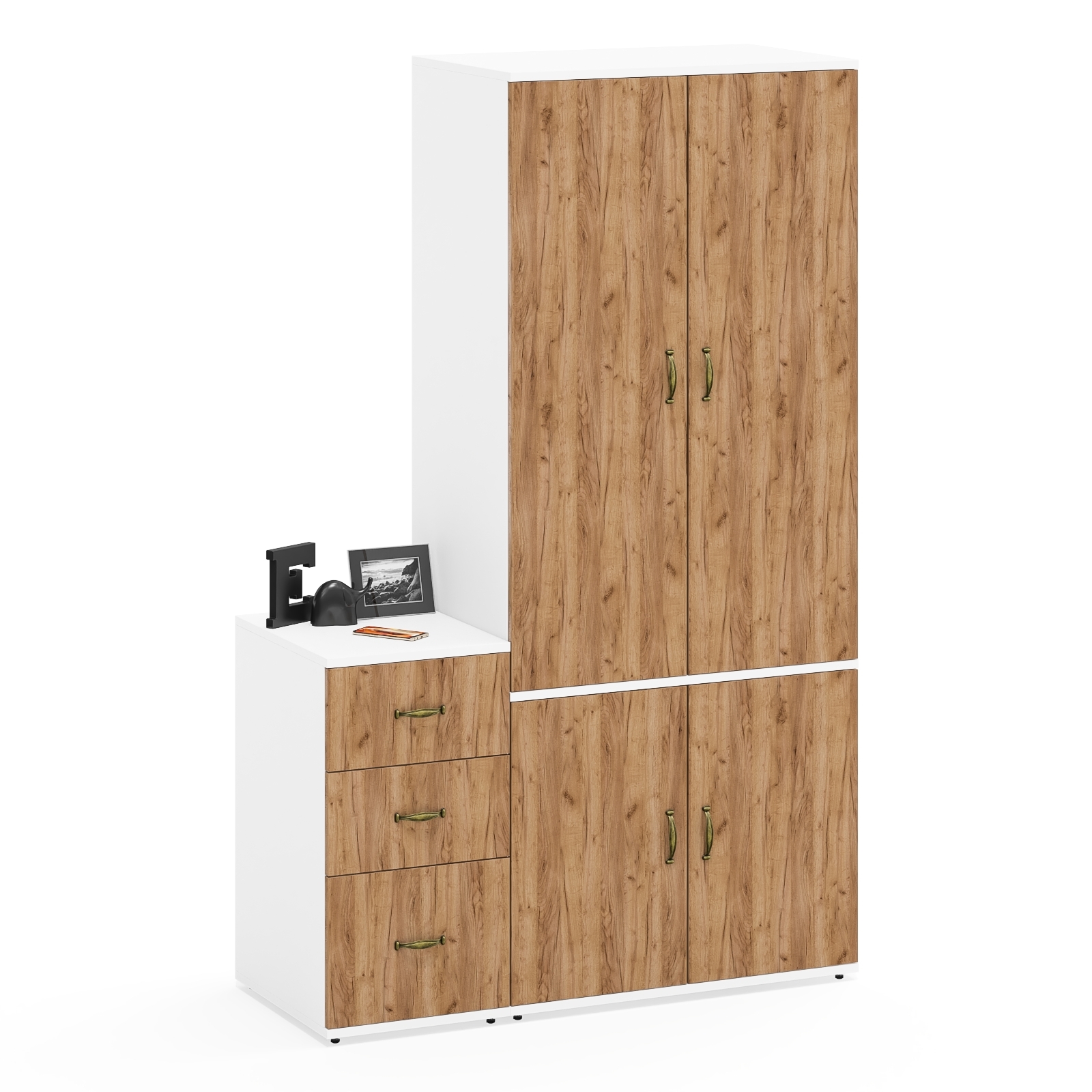 Шкаф Ш19Б состоит из двух отделений за двумя распашными дверками каждое. Верхнее отделение оснащено горизонтальной штангой для одежды на плечиках. Нижнее отделение с полкой по центру. Глубина шкафа 50 см позволяет удобно размещать одежду и другие предметы. Тумба 3.16 оснащена тремя ящиками - два компактных сверху и один вместительный снизу, все на шариковых направляющих.